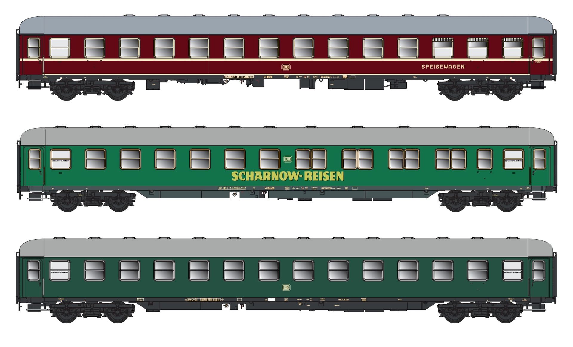 Ferienzug Scharnow-Reisen Set-A der DB, Epoche IV, bestehend aus DB-Speisewagen Bauart WRt4üm-51/64, DB-Liegewagen Bauart Bc4ümg-54/60 mit Schriftzug Scharnow-Reisen und einem DB-Liegewagen Bauart Bc4ümg-54 in grün