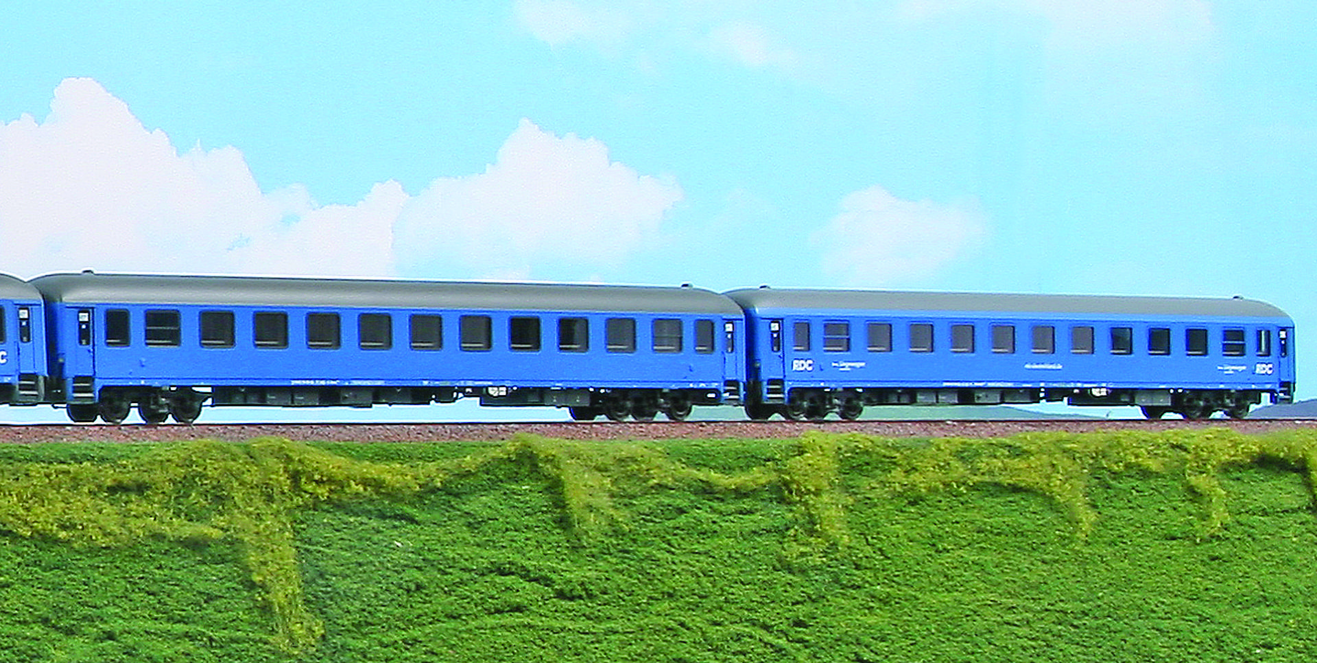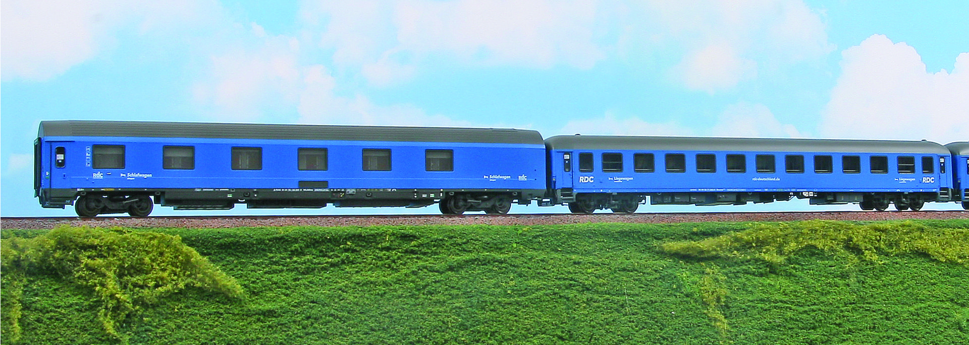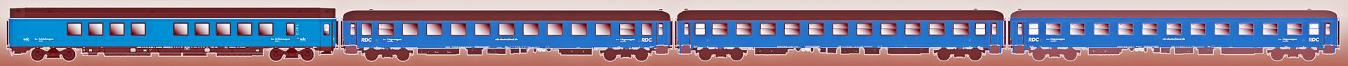 BTE AutoReiseZug „Lörrach ARZ – Hamburg-Altona“. Set bestehend aus Schlafwagen WLABmz-Schlafwagen Typ MUn und 3 Liegewagen Bvcmz 248.1 in blauer Lackierung der Privatgesellschaft RDC, Epoche VI.