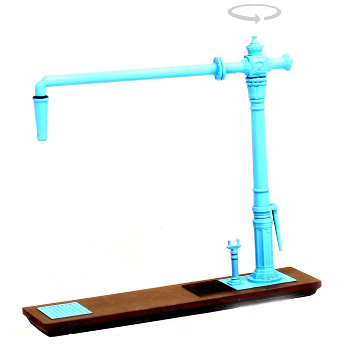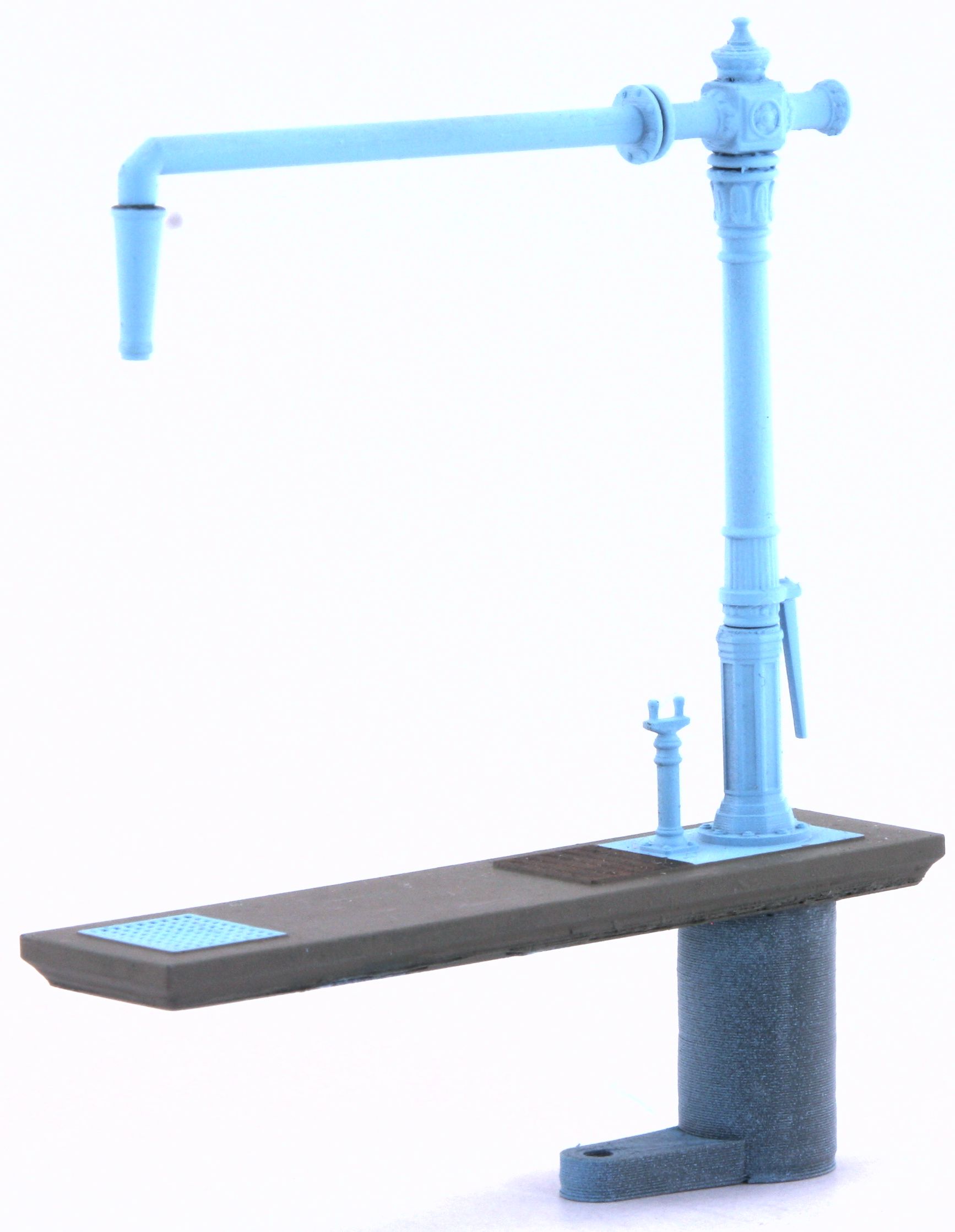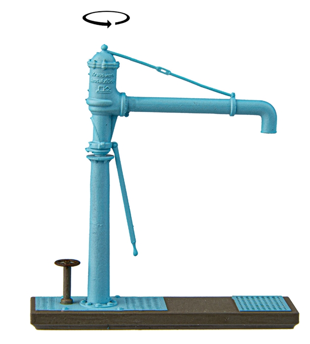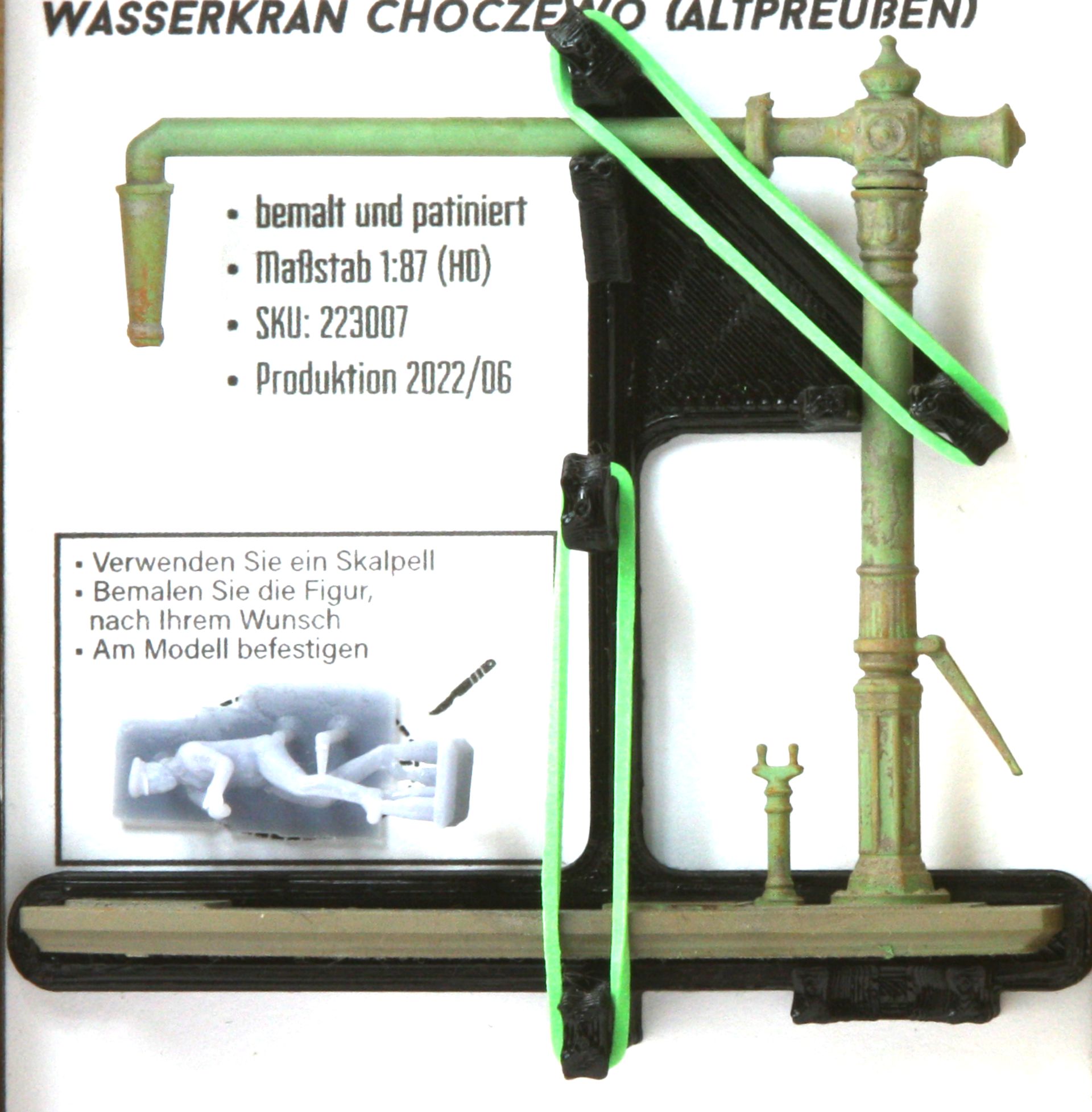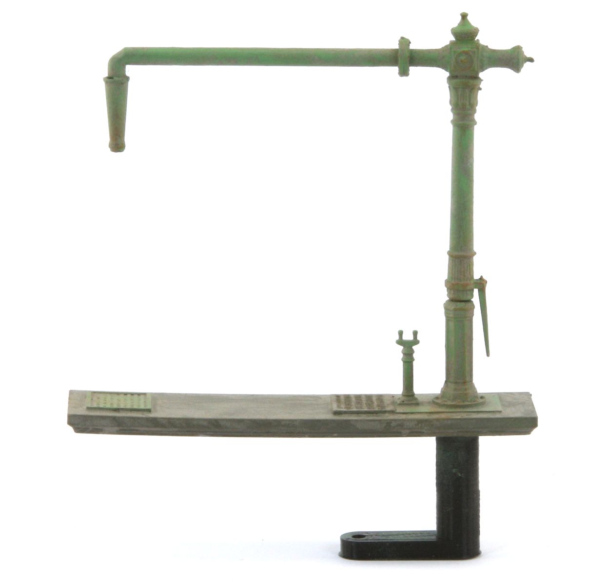 Patinierter Wasserkran für Servo-Antriebe. Vorbild Choczew (Alt Preussen). Beweglich, Fertigmodell mit Figur