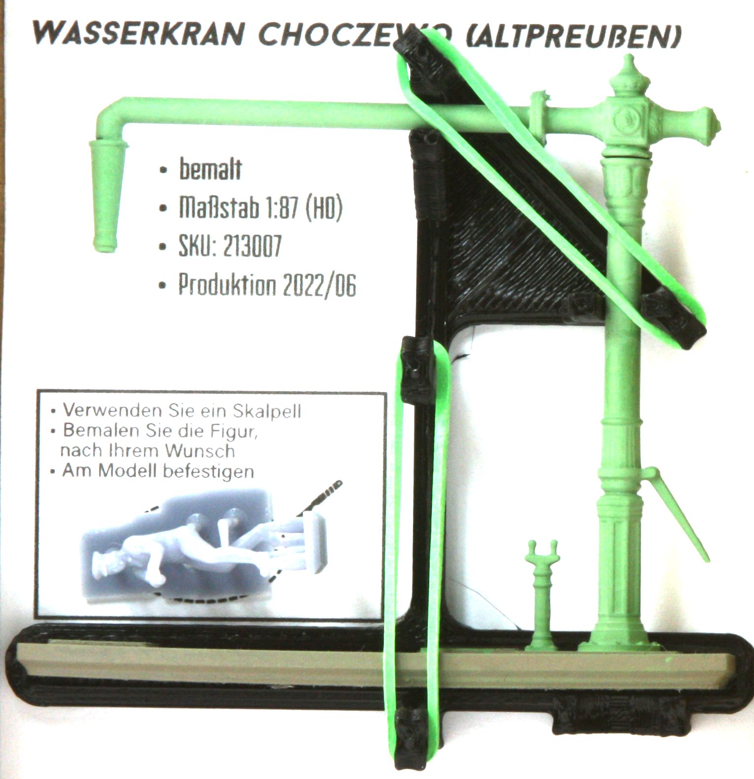 Der Arm des Wasserkrans ist beweglich. Das Set enthält eine unbemalte Eisenbahnerfigur. Passend ist der Wasserkran für die Epochen I bis III. Das Original befindet sich am Bahnhof in Choczewo.