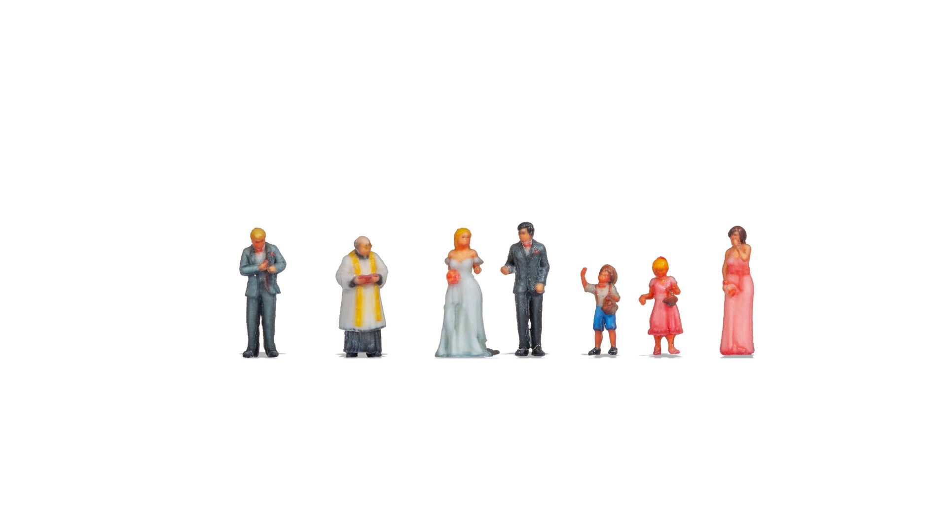 Eines der schönsten Themen, die man im Modell nachstellen kann: eine Hochzeit. Festlich in einen hellen Anzug gekleidet erscheint der blonde Trauzeuge des Bräutigams neben dem Pfarrer. Dieser hat bereits ein Auge auf das Brautpaar geworfen, das zu ihm an den Altar tritt und freut sich schon auf die Feier, auf die er ebenfalls eingeladen ist. Die wunderschöne,…
