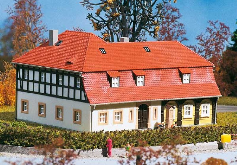 Der Block- und Fachwerkbau wurde originalgetreu nachgebildet. Antenne, Wasserpumpe und Bank liegen bei.