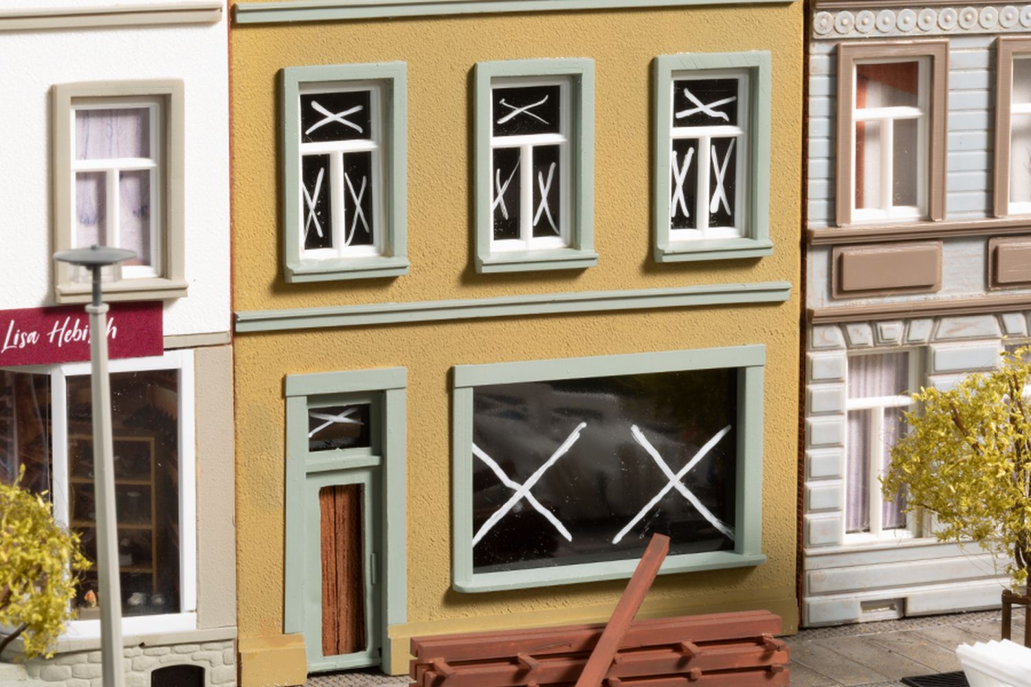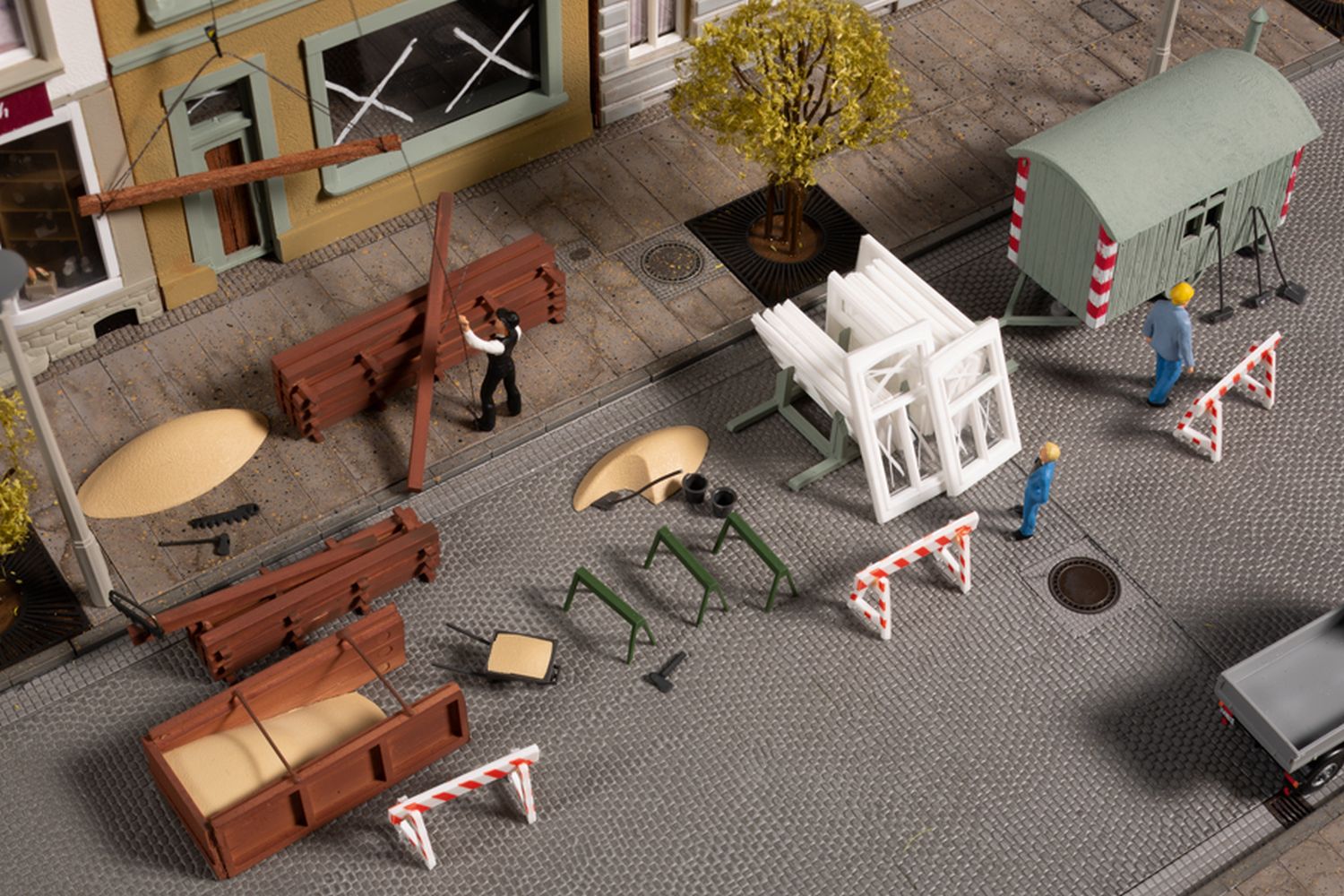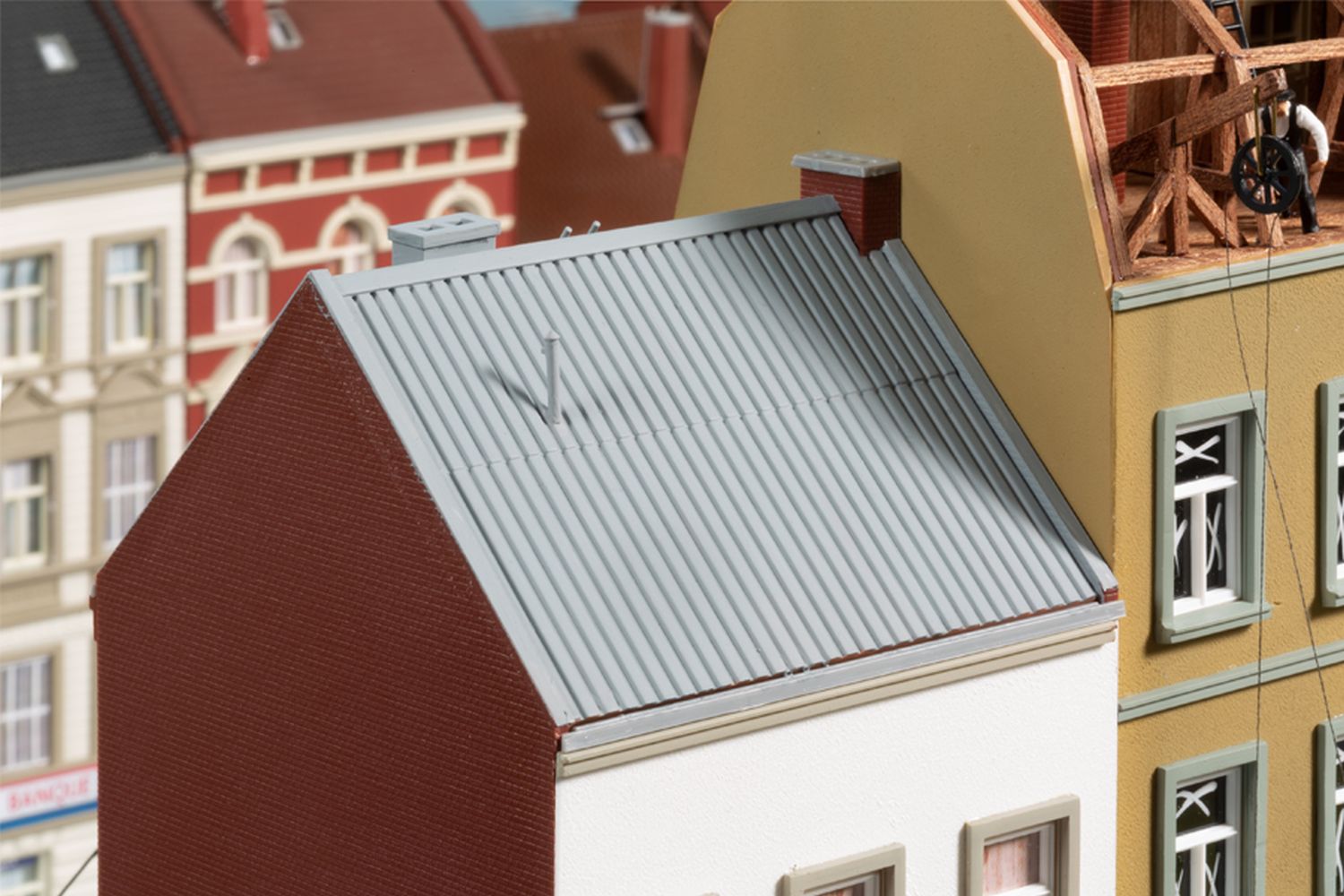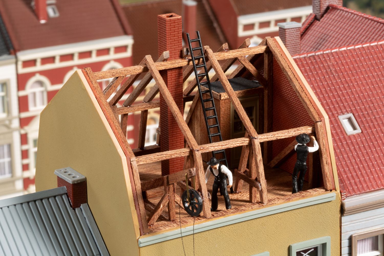Die Stadthäuser der Schmidtstraße finden sich seit Jahren auf vielen Modellbahnanlagen. Der Straßenzug wird nun wieder etwas länger. Auf Anregung einer Auhagen-Seminarteilnehmerin entstand ein Haus mit Schuhgeschäft. Besonderer Blickfang ist die Innenausstattung des Geschäfts und die Gestaltung des Eingangs mit gebogenen Schaufenstern. Für Abwechslung in der Schmidtstraße sorgt das graue Dach. Das zweite Gebäude wird gerade saniert. Die Fensterscheiben sind zur Sicherheit mit weißen Kreuzen bemalt, als Zeichen, dass Glasscheiben drin sind! Die Zimmerleute arbeiten am Dachstuhl. Material wird mit einem Seilzug nach oben befördert. Als Ausstattung liegen dem Bausatz viele Baustellen-Utensilien bei: Holzstapel, Böcke, Fenster, Werkzeug aller Art und eine Kiesschütte aus dicken Holzbohlen. Am Modell des Bauwagens sind Warnecken aufgedruckt.