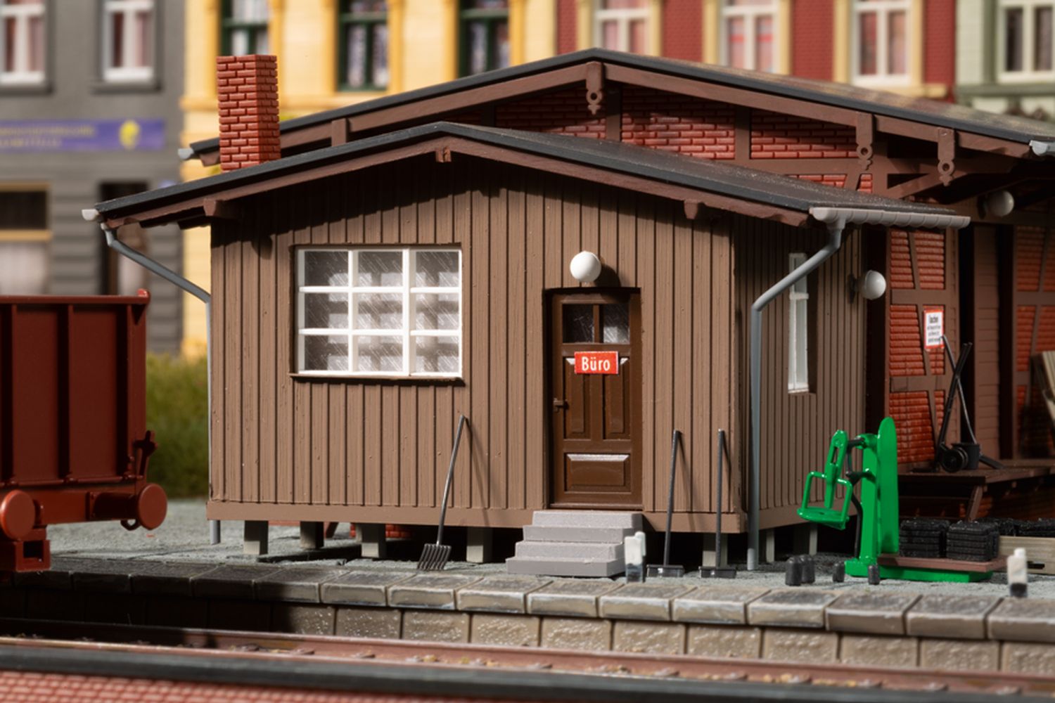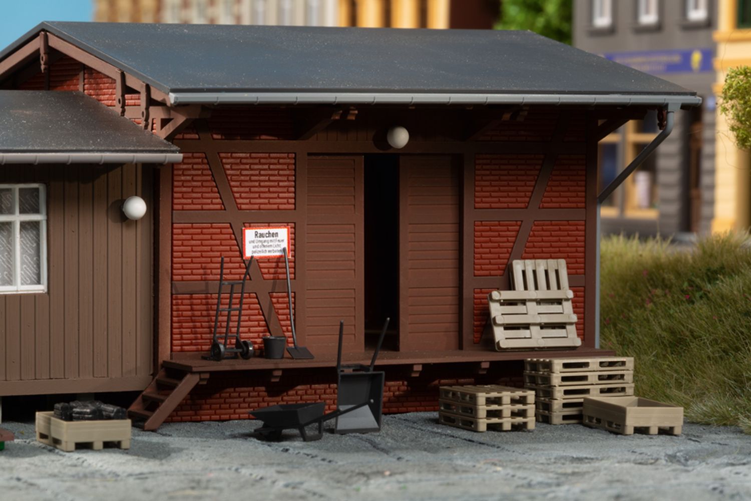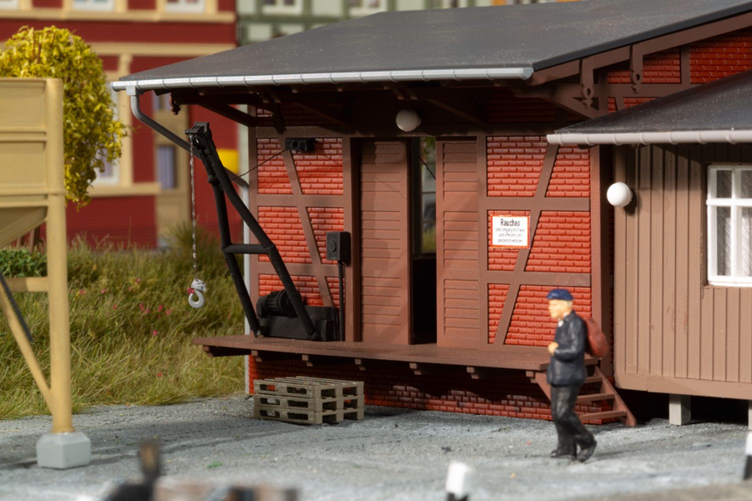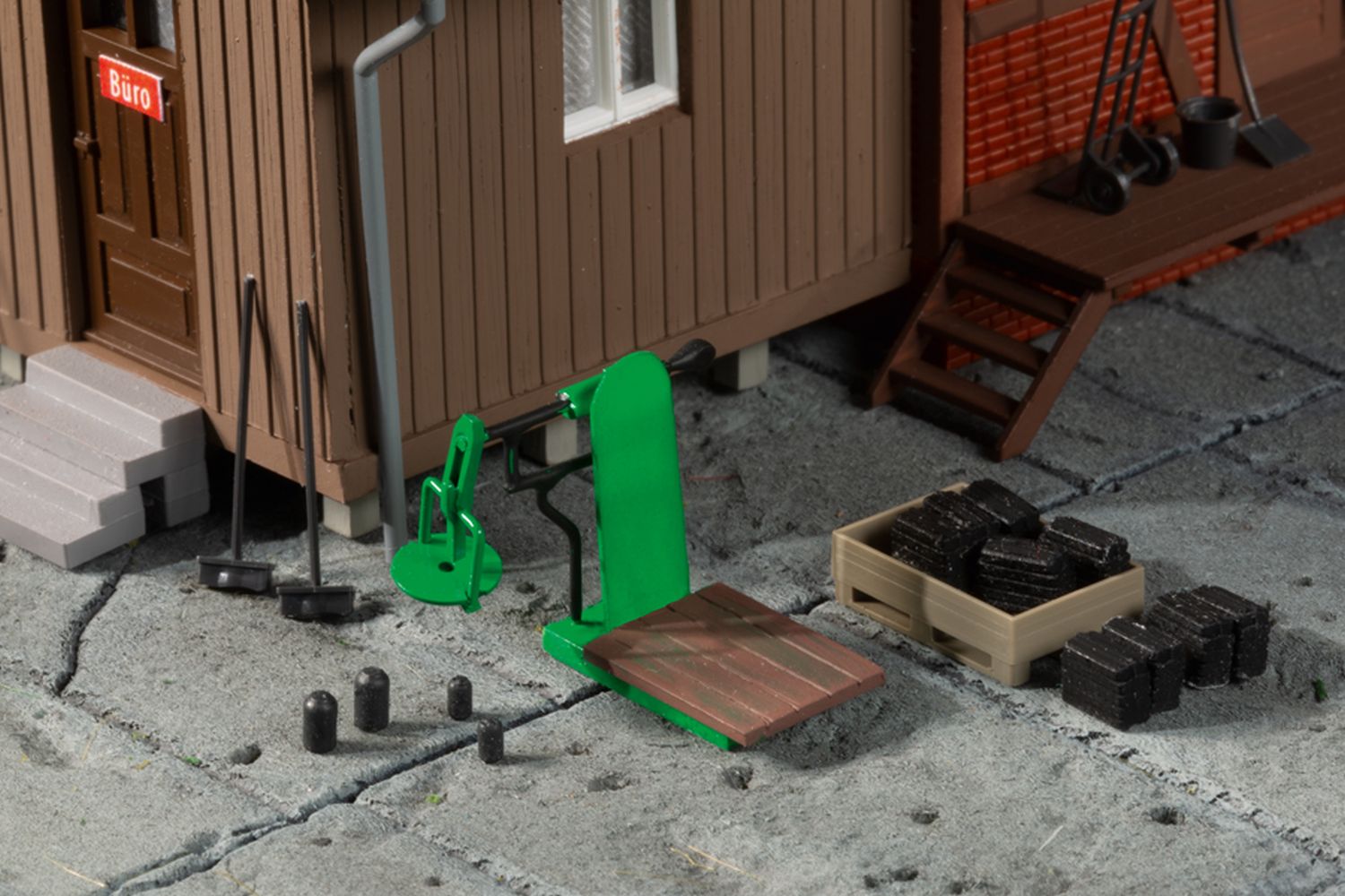 Brennstoffhandlungen gehörten früher fast überall zum Ortsbild. In unserem – eher kleinen – Modell gibt es Brennstoffe jeglicher Art. Mit der Sackwaage werden die Lieferungen für die Kunden vor der Verladung abgewogen. Für schwerere Güter gibt es am Lagerschuppen einen Wandkran, der beweglich ist. Das Klinkerfachwerkgebäude wird durch einen holzverschalten Büroanbau ergänzt. Für die Ausgestaltung liegen dem Bausatz Werkzeuge, wie z.B. Schaufeln, Besen und Schubkarren sowie Brikettstapel und Paletten bei.
