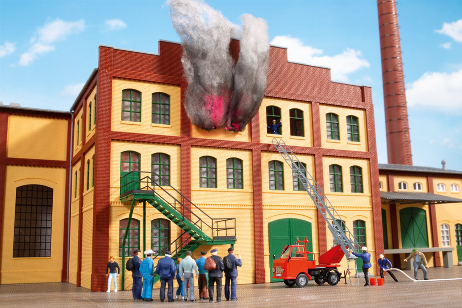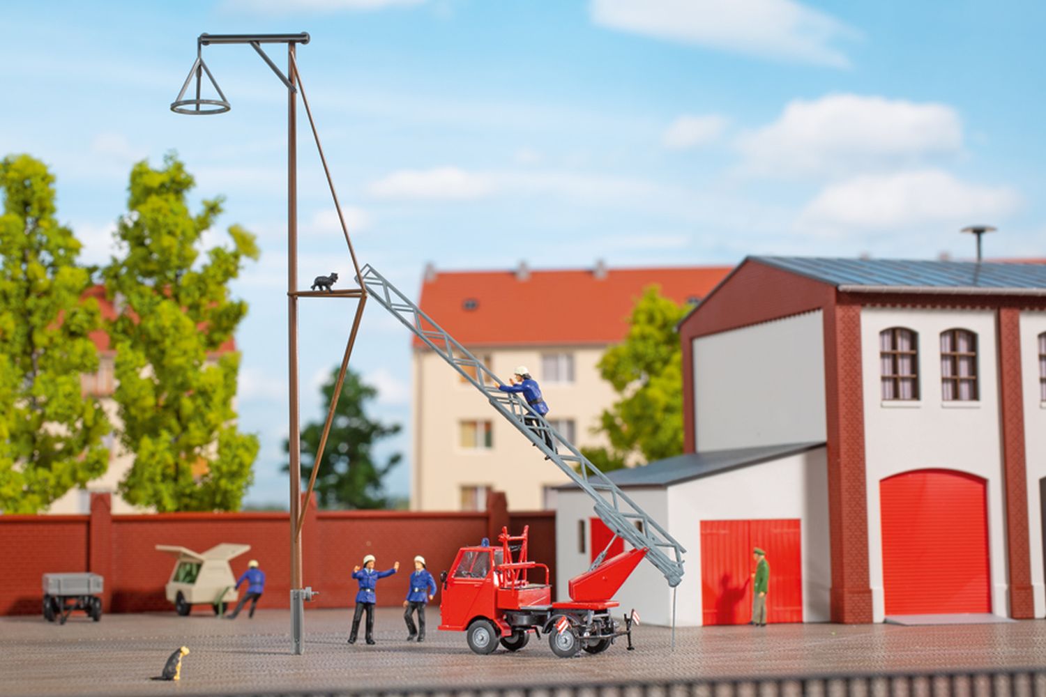 Bausatz. Mit vorbildgerechter Bereifung, Spiegel, Scheibenwischer, Hängerkupplung, Rundumleuchte sowie einer Dekoration mit Nummernschildern verschiedener Länder. Stützen mit Fahnen werden mit einem Decal dekoriert und beim Einsatz benötigt. Die Vorderräder können auch eingelenkt dargestellt werden. Die Leiter ist dreh- und ausziehbar. Auf dem Decal sind auch verschiedene Beschriftungen zu finden.