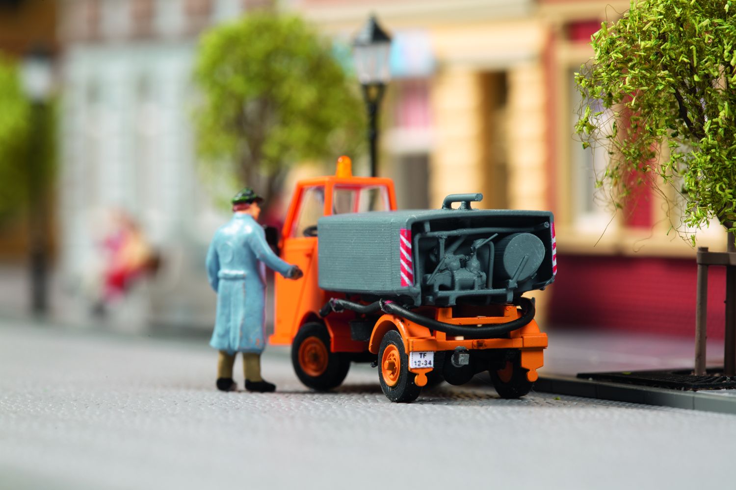 Bausatz eines Wassertankfahrzeuges auf Basis des Multicars M22. Befüllt wird der im Original 1600-Liter-Tank mit einem Saugschlauch, der während Nichtbenutzung um den Tank gelegt mitgeführt wird. An der Rückseite des vorbildgetreu bedruckten Behälters sind eine Schlauchtrommel und die motorhydraulische Pumpe wettergeschützt untergebracht. Mit vorbildgerechter Bereifung, eingelenkt darstellbarer Vorderachse sowie einem beiliegenden Druckbogen mit nationalen und internationalen Nummernschildern.
