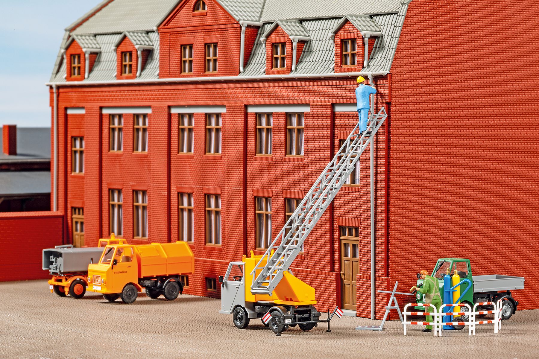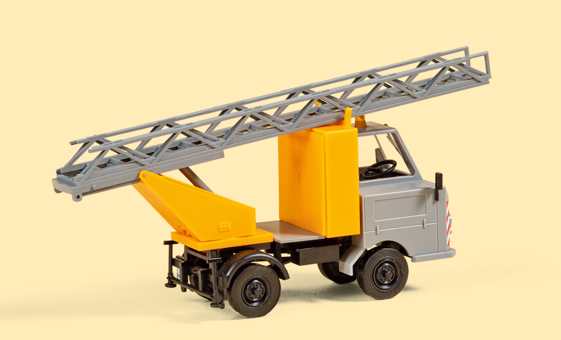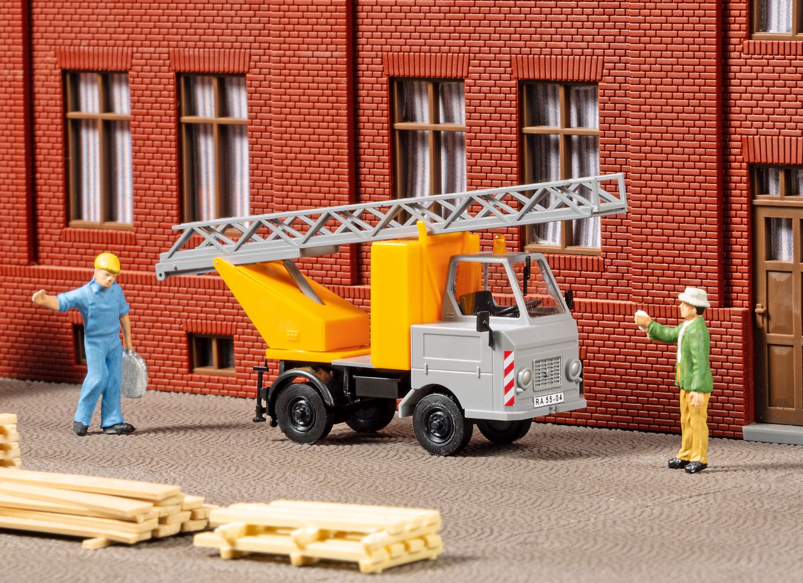 Bausatz. Mit vorbildgerechter Bereifung, Spiegel, Scheibenwischer, Hängerkupplung, Rundumleuchte, neuem Werkzeugkoffer statt Sitzbank sowie einer Dekoration mit Nummernschildern verschiedener Länder. Die Vorderräder können auch eingelenkt dargestellt werden. Die Leiter ist dreh- und ausziehbar.