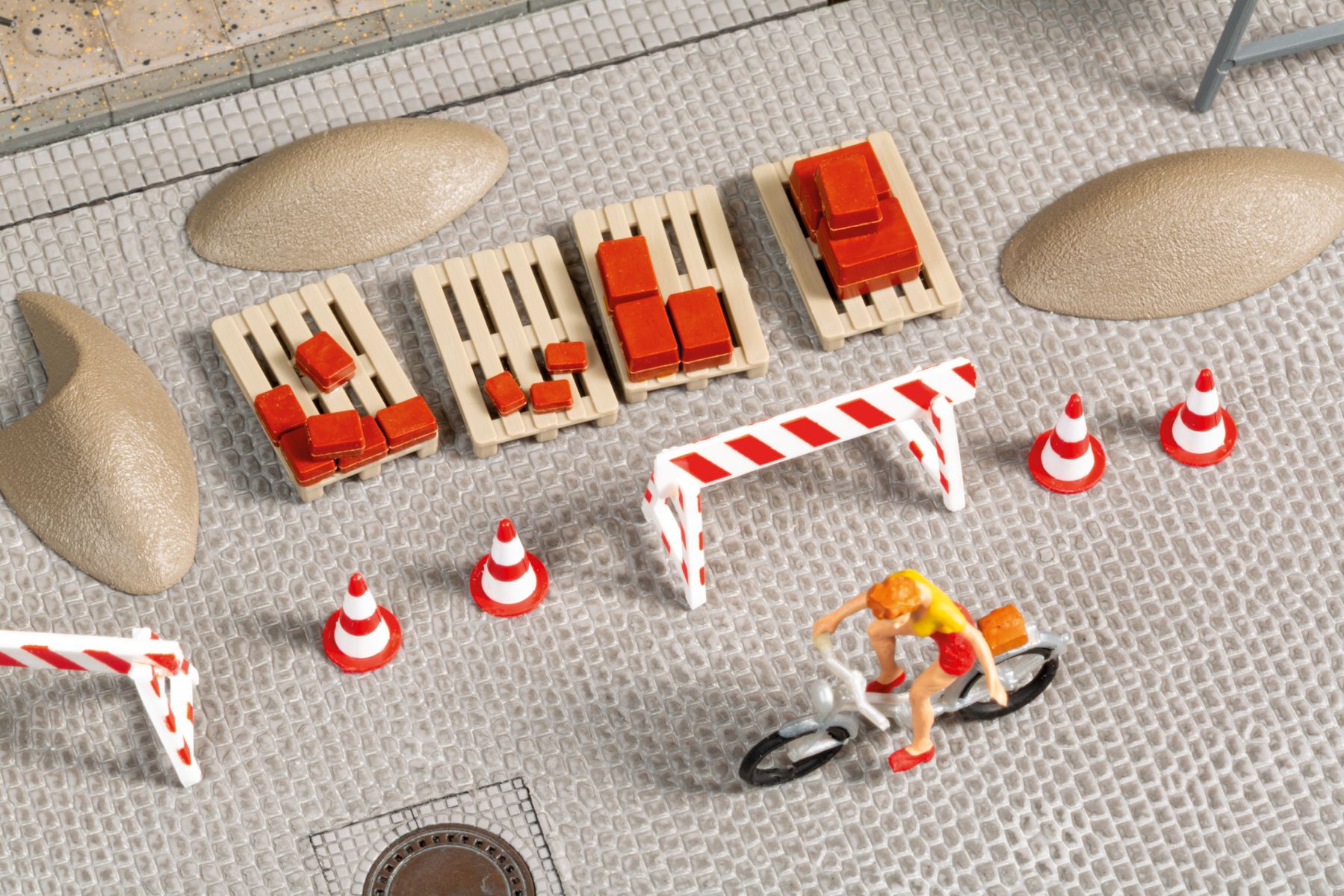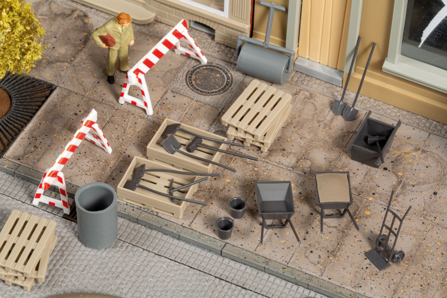 Ein sehr umfangreicher Bausatz, mit dem eine Baustelle sofort glaubwürdig wirkt. Ob Stadt oder Land, diese Szene findet fast überall ihren Platz. Enthalten sind unter anderem 2 Mobiltoiletten, Schüttguthaufen, Verkehrsleitkegel, Paletten mit Ziegeln, Warnbaken sowie Mischtrommel, Silo, Walze, Schippen, Schaufeln und Werkzeug.