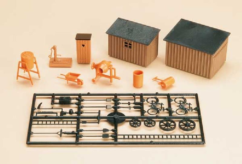 Toilette und zwei kleine Schuppen in Holzmanier. Auch eine gusseiserne Wasserpumpe liegt bei.