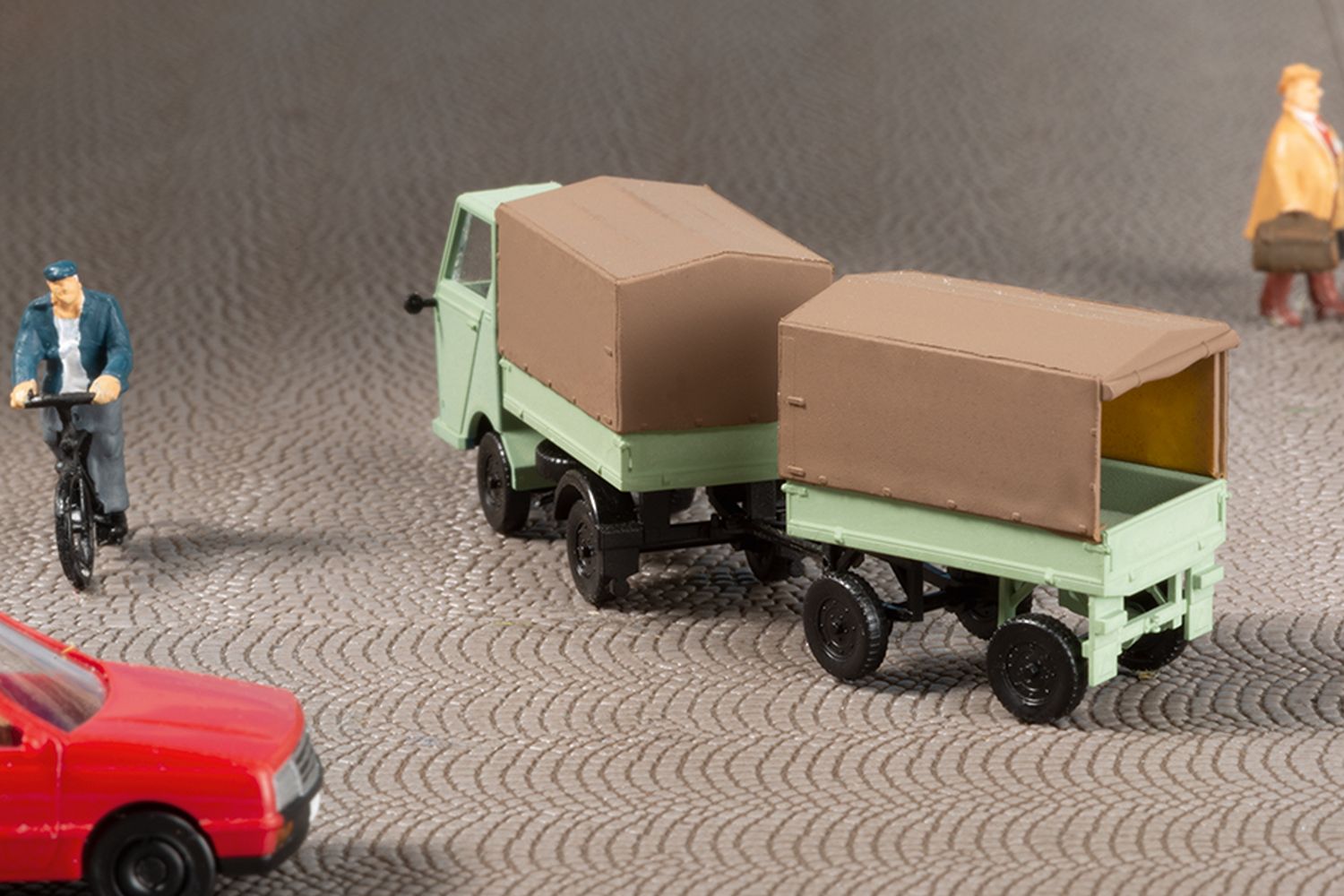 Bausatz. Der Multicar M22 wurde von 1964- 74 im VEB Fahrzeugwerk Waltershausen gebaut. Das Modell nach einem Vorbild in mintgrüner Farbe hat Spiegel, Scheibenwischer und eine Kupplung für den dazugehörigen Anhänger. Kühlergrill und Scheinwerfer sind filigran bedruckt.