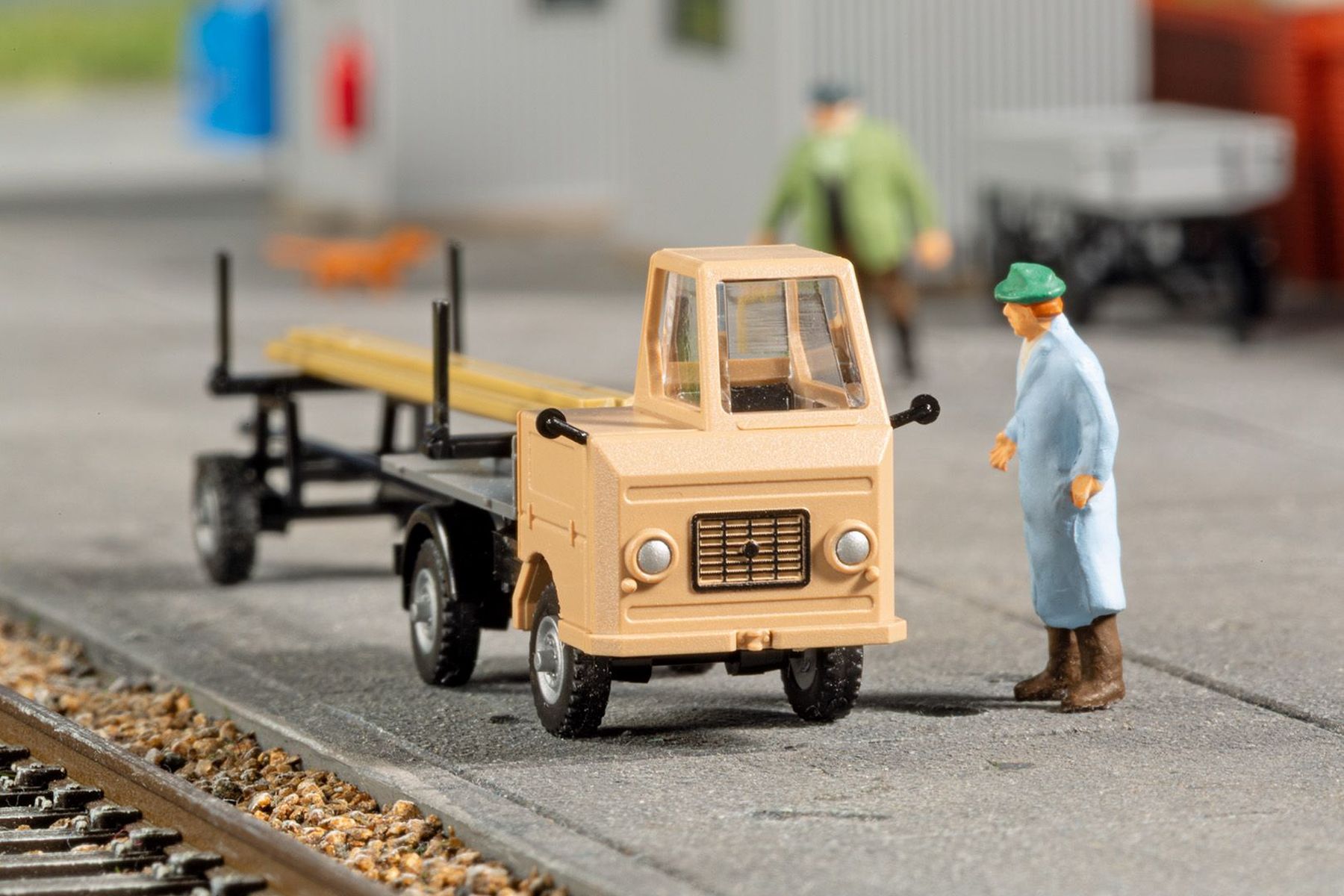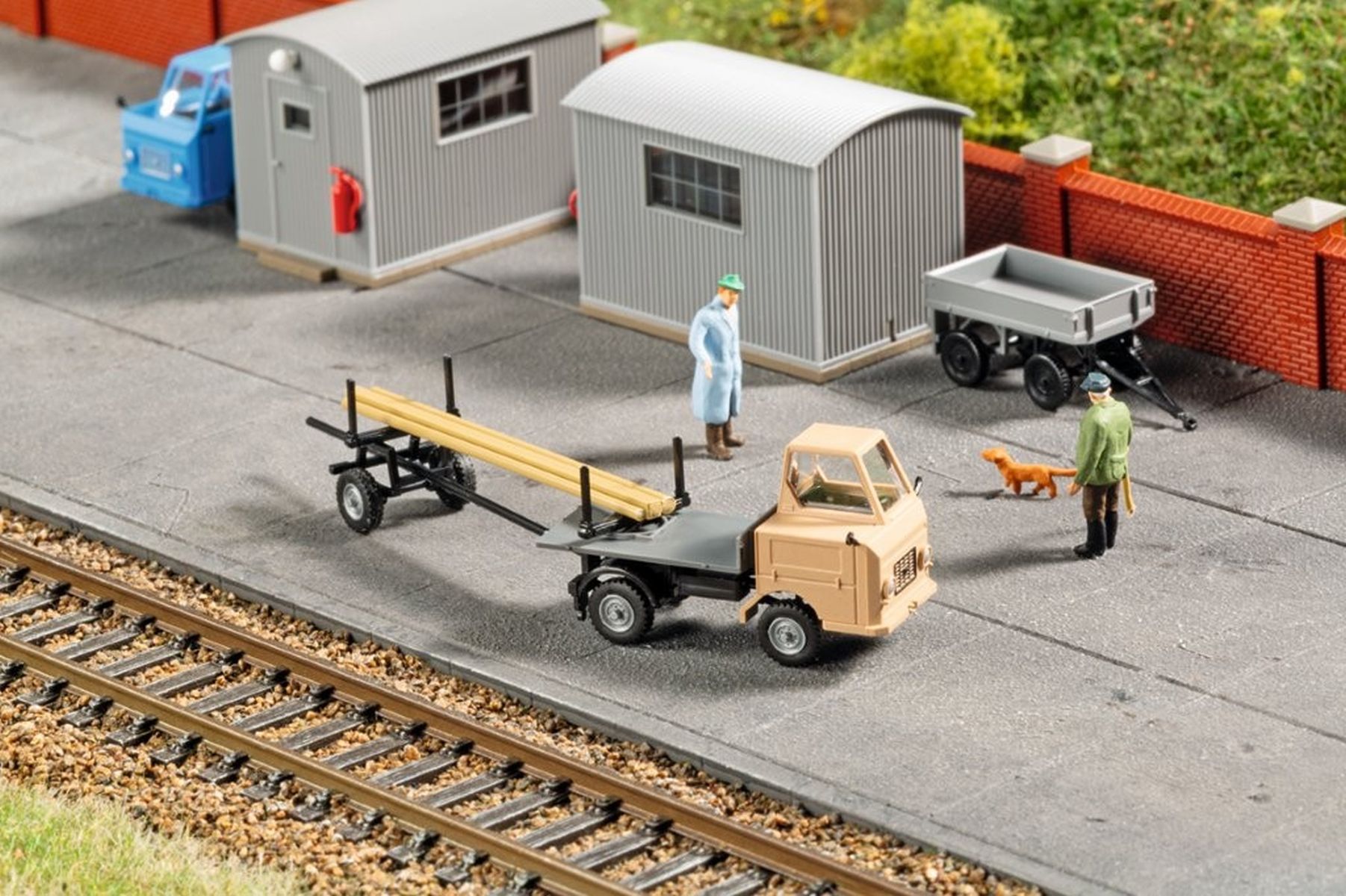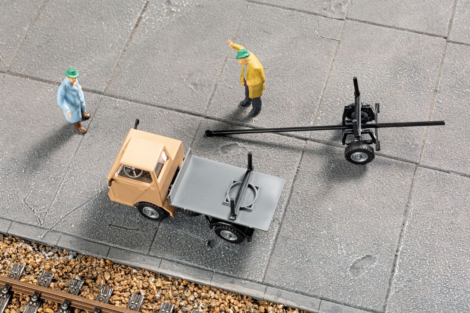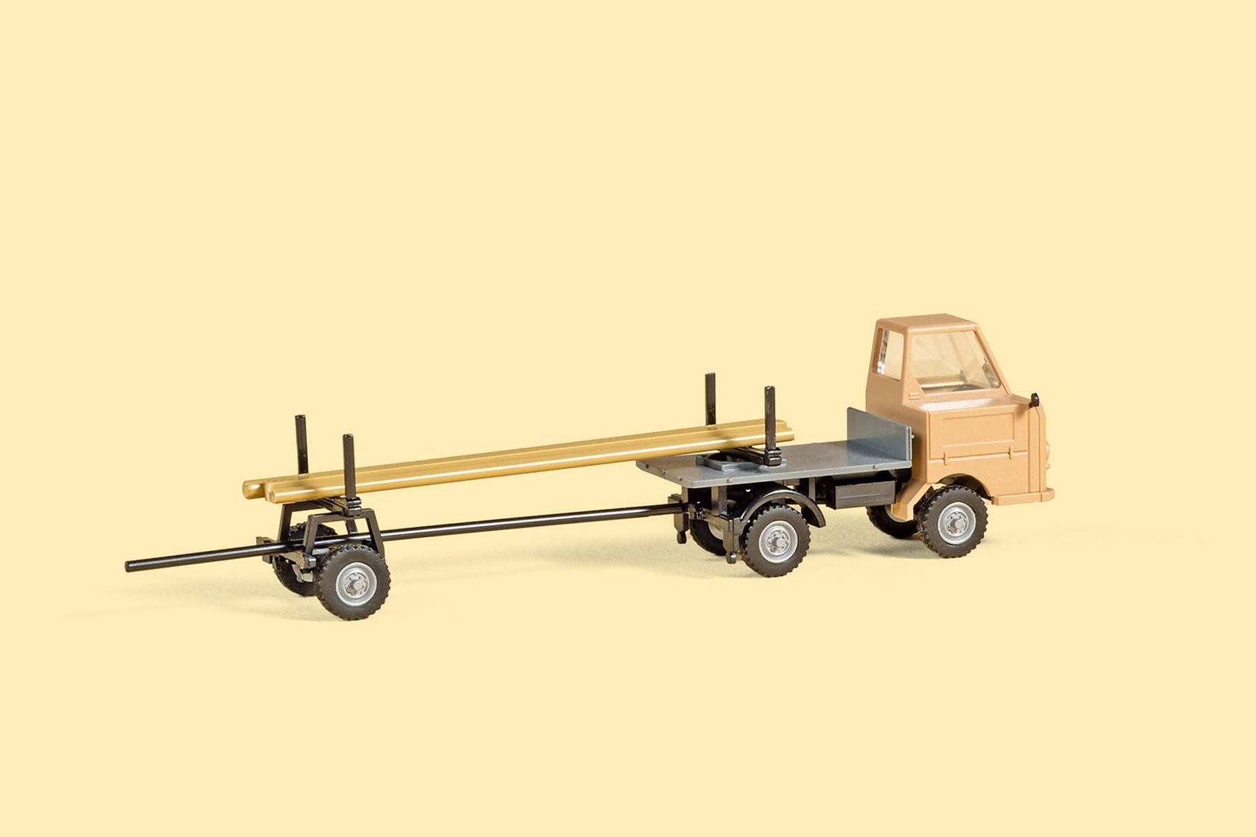 Bausatz. Zum sicheren Transport für lange Güter, in diesem Fall beiliegende Holzmasten, bietet sich ein gezogener Nachläufer ideal an. Hier ruht die Ladung sowohl auf dem Drehschemel des bekannten Multicar M22 Modells als auch zwischen den Rungen des mit einer verstellbaren Zugstange verbundenen Nachlaufanhängers.