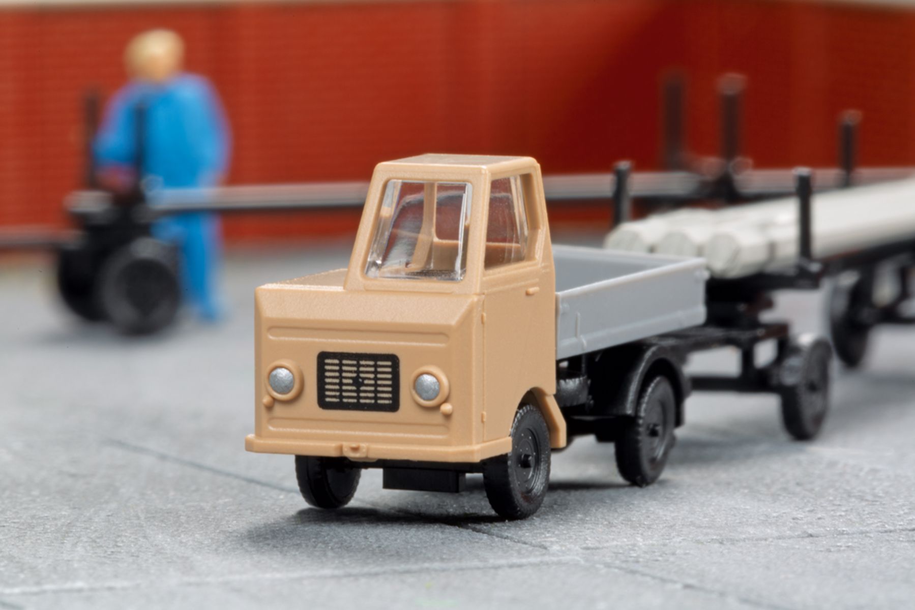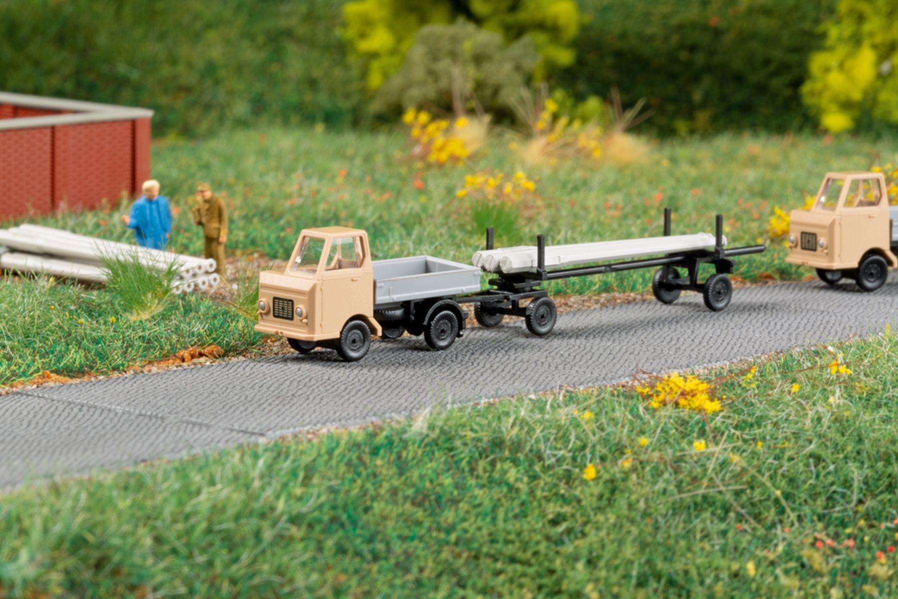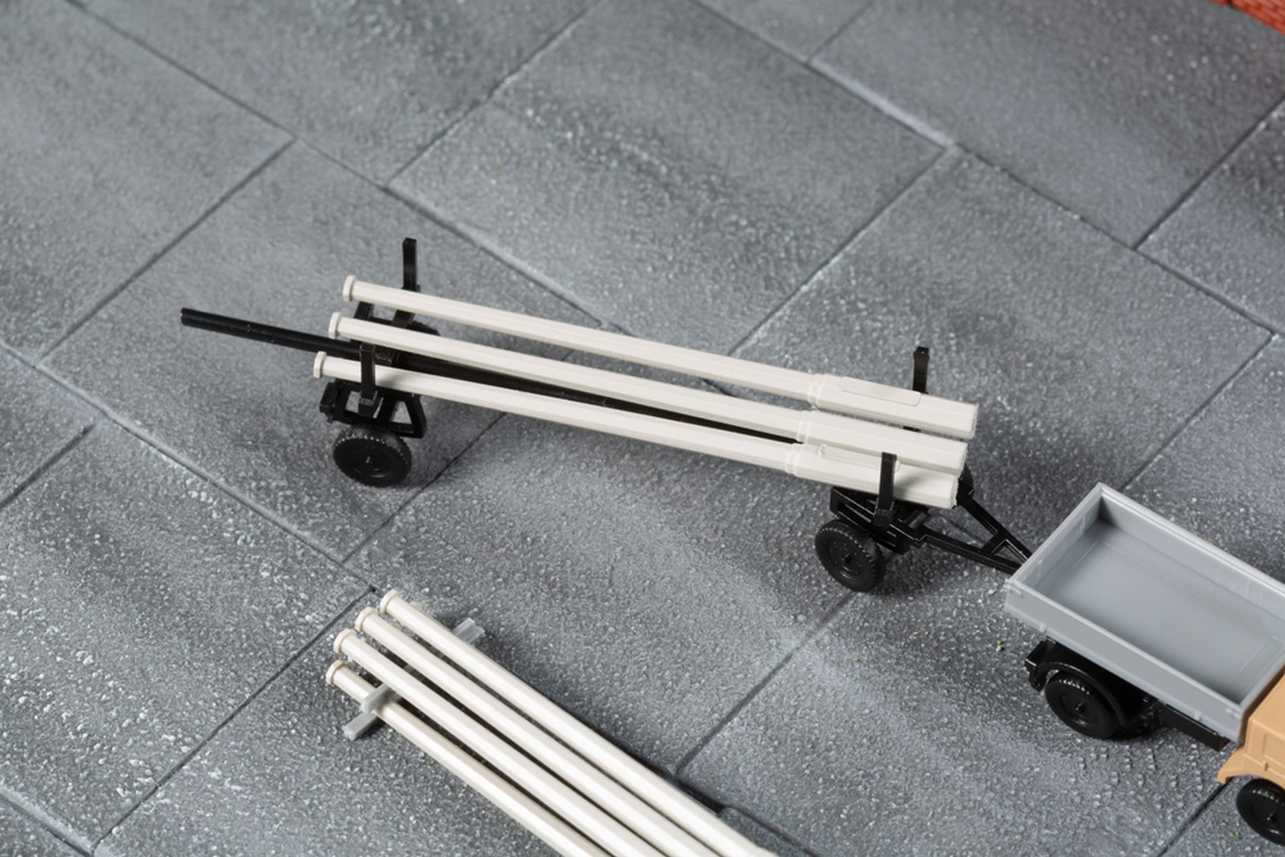 Bausatz. Das fein detaillierte und bedruckte Modell des Kleintransporters Multicar M22 zieht hier in einer neuen Farbgebung einen filigranen Langmaterialanhänger. Die beiliegende Ladung, bestehend aus Spannbetonmasten fu¨r die Straßenbeleuchtung, macht das Gespann zu einer guten Ergänzung des Modells 14 489 Transformatorenhäuschen.