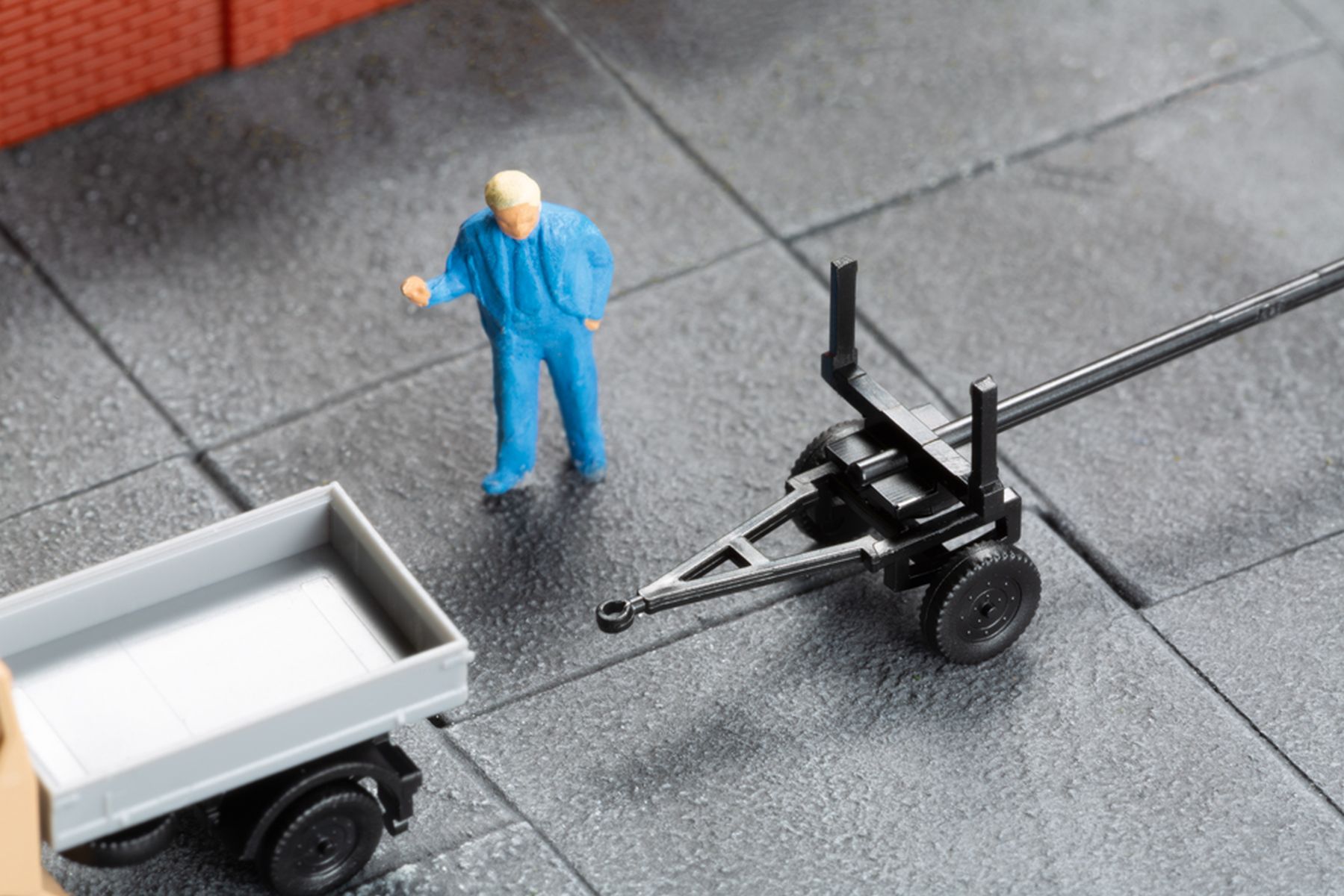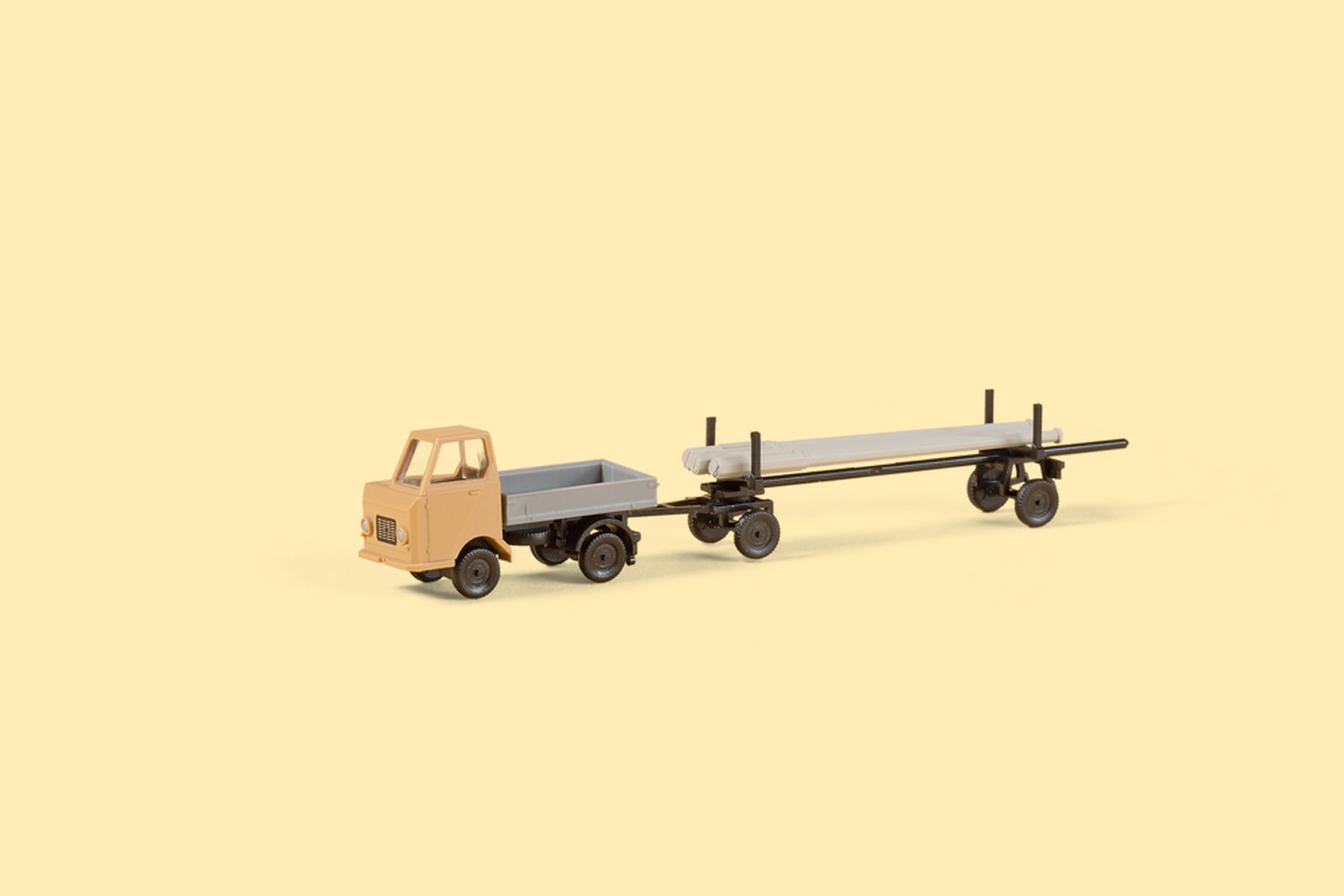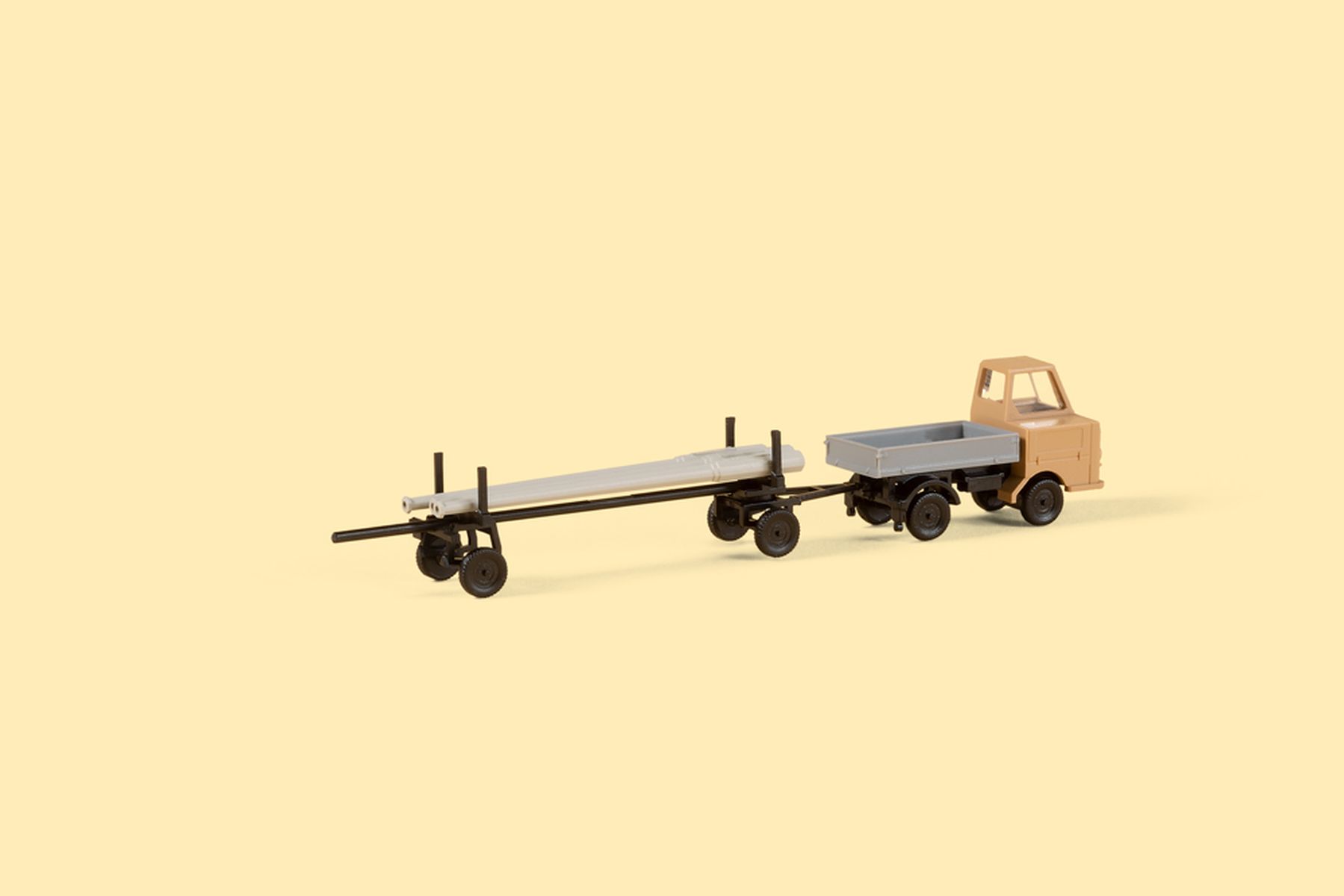 Bausatz. Das fein detaillierte und bedruckte Modell des Kleintransporters Multicar M22 zieht hier in einer neuen Farbgebung einen filigranen Langmaterialanhänger. Die beiliegende Ladung, bestehend aus Spannbetonmasten fu¨r die Straßenbeleuchtung, macht das Gespann zu einer guten Ergänzung des Modells 14 489 Transformatorenhäuschen.
