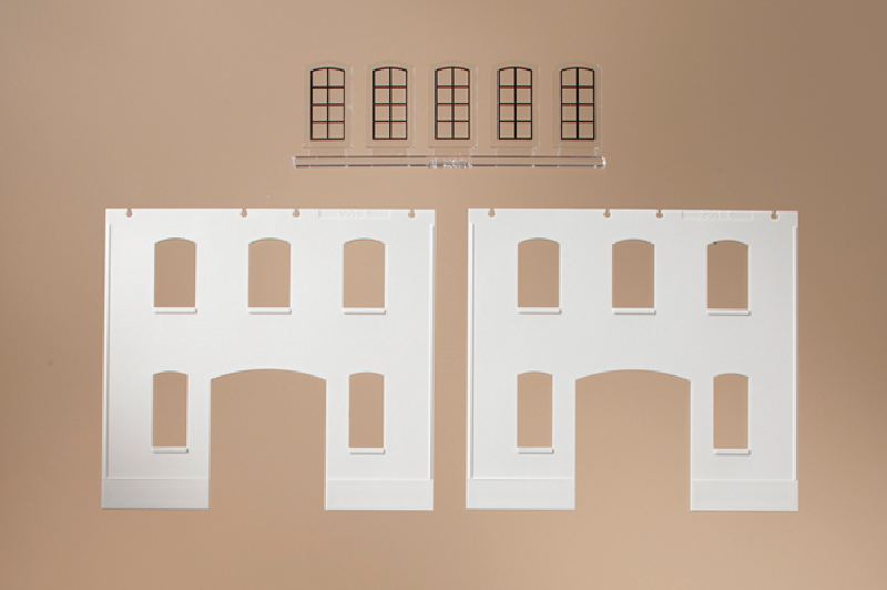 2 Wände mit Fenster- und Toröfnung. 5 Fenster bedruckt für Erdgeschoss. Je 94 x 86 mm