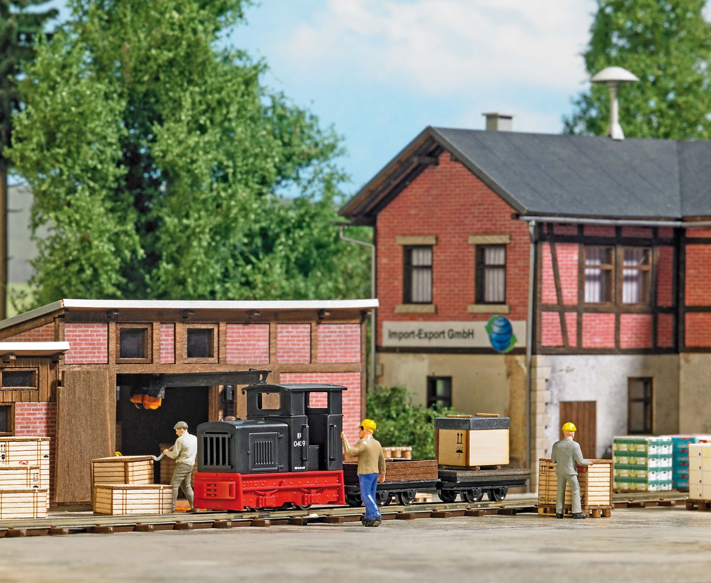 Mit Feldbahndiesellokomotive Gmeinder 15/18 in geschlossener Ausführung, Wagen mit Transportkiste aus echtem Holz und Niederbordwagen. Gleise und Batteriekasten für 2 Batterien LR6/AA (nicht enthalten) und Schalter (Vorwärts/Rückwärts/Stopp).