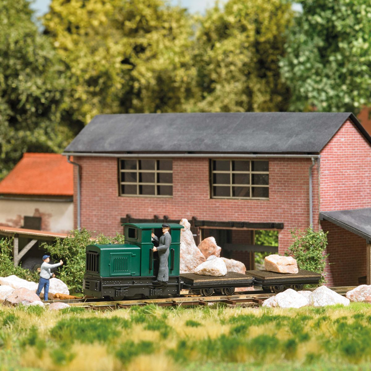 Feldbahndiesellokomotive Gmeinder 15/18 in geschlossener Ausführung und 2 Transportwagen beladen mit Felsbrocken. Wagenböden aus echtem Holz. Inklusive Gleisen, Batteriekasten (für 2 Batterien LR6/AA, nicht enthalten) und Schalter (Vorwärts/Rückwärts/Stopp).