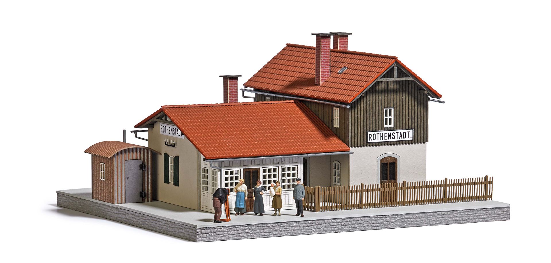Das Empfangsgebäude hat eine interessante und für Bahngebäude der Region typische Aufteilung durch den quer zum Bahnsteig stehenden höheren Gebäudeteil, in dem sich auch die Dienstwohnung befindet, sowie dem längs zum Bahnsteig angeordneten niedrigeren Gebäudeteil mit dem angebauten Warteraum. Die Struktur der verputzten Wände ist realistisch dargestellt. Der Dachgiebel besteht aus echtem Holz. Das Ziegeldach mit dem großen Dachüberhang hat eine vorbildgerechte Struktur in Optik und Haptik. Regenrinnen, Fallrohre und Isolatoren für die Stromversorgung sind filigran ausgeführt. An der Rückseite befindet sich ein kleiner Holzschuppen als Anbau. Weitere Echt-Holz-Teile sind die Türen, Sprossenfenster und Klappläden. Mit Holzzaun als Bahnsteigsperre. Alle Holzelemente sind bereits fertig koloriert. Beleuchtbar mit Busch LEDs 5998. Bausatz. Größe: 168 x 147 mm, Höhe: 100 mm. Größe Grundplatte mit Steinsockel: 200 x 183 mm, Höhe: 9 mm.