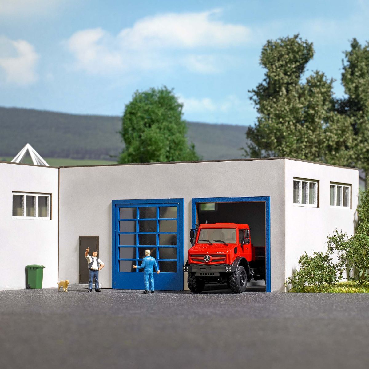 Modernes Werkstattgebäude, das aufgrund des gleichen Baustils auch als perfekte Erweiterung an die Busch Fahrzeughalle 1966 angebaut werden kann. Bausatz mit zwei großen Einfahrten, Flachdach und Fensterreihen. Beleuchtbar mit Busch LEDs 5998. Größe: 130 x 101 mm, 63 mm hoch. Durch einen stabilen, zusammensteckbaren Unterbau, der mit den fertig geschnittenen und kolorierten Teilen verkleidet wird, ist der Zusammenbau besonders einfach. Zusätzlich sind lediglich ein Bastelmesser und Modellbaukleber (z.B. Busch 7599) oder Alleskleber (z.B. UHU® Kraft) erforderlich.