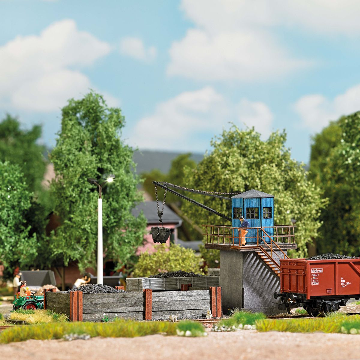 Dieser Bekohlungskran ist von seiner Bauweise her ein typisches Modell, das so oder in sehr ähnlicher Form in namhaften Bahnbetriebswerken zum Einsatz kam. Auch heute noch sind Bekohlungskräne dieser Art bei vielen Museumsbahnen im Betrieb. Das Modell des Bekohlungskrans ist also universell einsetzbar. Er besteht aus einem Mauersockel mit seitlichem Treppenaufgang zur Plattform aus echtem Holz. Das Kranführerhaus ist in achteckiger Holzbauweise ausgeführt und um 360 Grad drehbar. Mit Heb- und senkbarem Kranausleger. Kranhaken mit filigraner Gliederkette aus Metall. Die Kette ist beweglich gelagert und wird durch eine Öffnung an der Unterseite des Sockels herausgeführt. Durch Ziehen an der Kette kann der Kranhaken bewegt werden. Mit Kohlehunt zum Anhängen. Alle Holzteile fertig koloriert. Beleuchtbar mit Busch LEDs 5998. Bausatz. Größe ohne Kranausleger: 52 x 51 mm, Höhe: 79 mm. Länge Kranausleger: 56 mm.