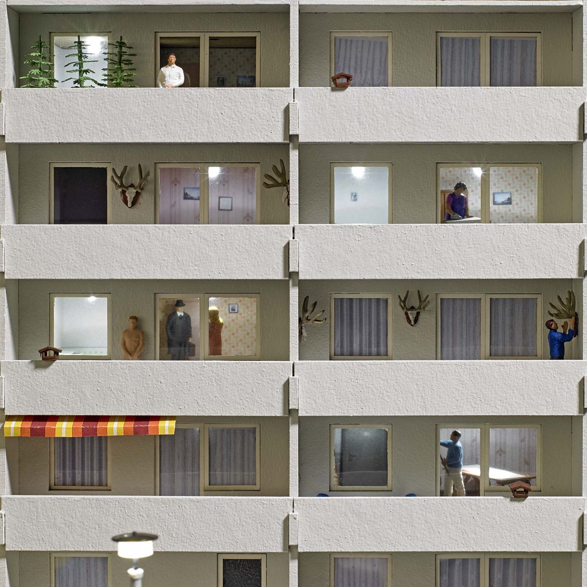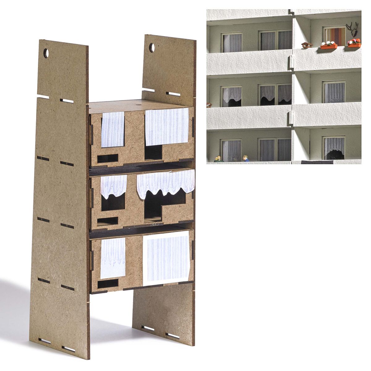 Bausatz für 3 Wohnungen als Innenaustattung für die WBS 70 Gebäude von Busch Nr. 1926/1927. Zur Befestigung in beliebiger Etagenhöhe an den in beiden Gebäude-Sets enthaltenen Innen-Seitenwänden. Bevor diese Innenkonstruktion mit Wohnungselementen von oben in das Gebäude eingeführt wird, können die Zimmer eingerichtet und beleuchtet werden. Mit Ausschneidebogen für Bodenbeläge und Wanddekoration. Zum selbst Ausgestalten der Zimmer eignen sich perfekt die Einrichtungssets »Malerarbeiten«, »In flagranti« und »Bügelarbeiten«, Busch Nr. 1991-1993. Beleuchtbar mit Busch LEDs 5998.