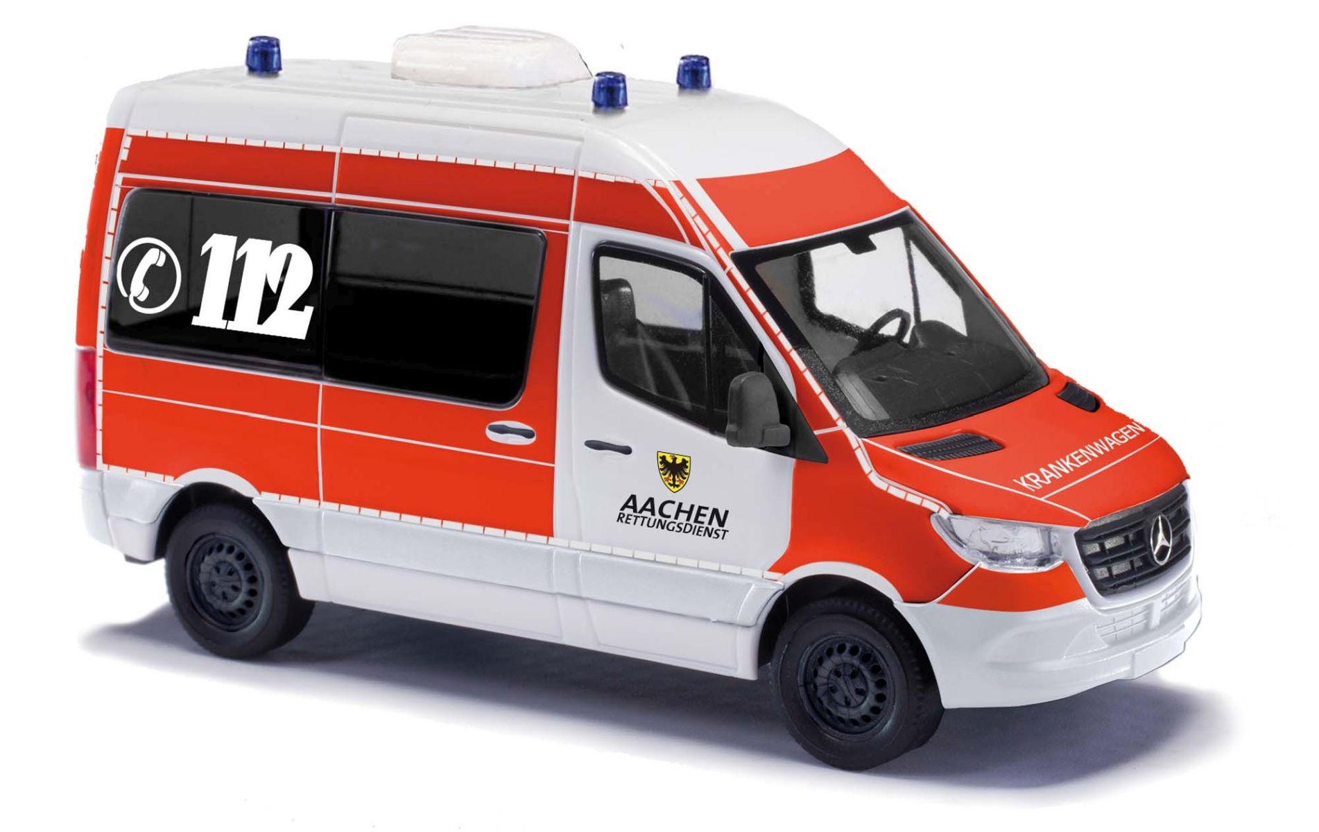 Weiß/leuchtrotes Einsatzfahrzeug des Rettungsdienstes der nordrhein-westfälischen Printen-Stadt Aachen. Markant an allen Aachener Einsatzfahrzeugen sind die weißen Fahrer- und Beifahrertüren der sonst weitesgehend leuchtroten Einsatzfahrzeuge.