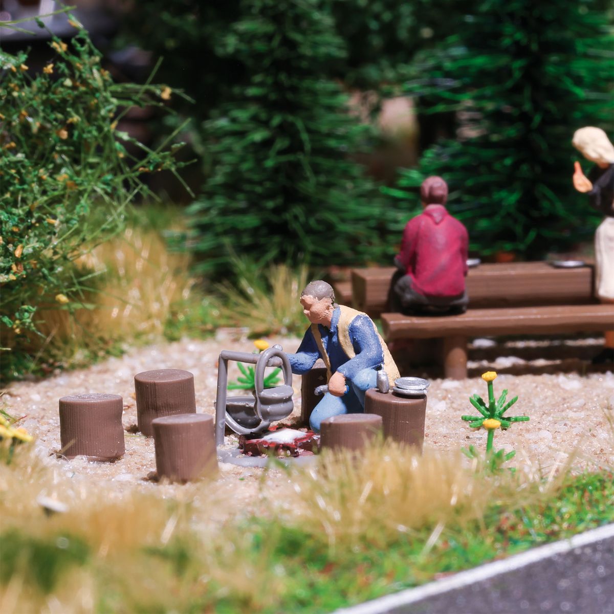 Set mit viel Zubehör für eine stimmungsvolle Outdoor-Szene: Im Mittelpunkt steht das mit LEDs beleuchtete Lagerfeuer, das von einem Mann (Figur fertig bemalt) sorgfältig entfacht wird. Umgeben von Holzbänken und Holztisch, Holzpflöcken, Campinggeschirr, Grillgut, Eimer und 3 Tannen fehlt jetzt nur noch die Dunkelheit, damit die Glut effektvoll leuchten kann.