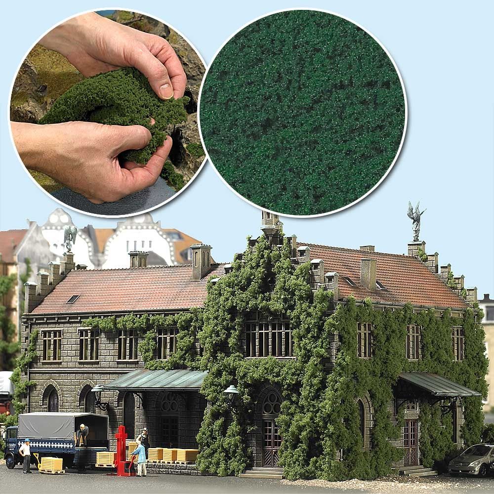 Durch ein spezielles Herstellungsverfahren werden Micro-Flocken zu einem 150 x 250 mm großen Geflecht strukturiert ohne dass ein Trägergewebe verwendet wird. Dadurch kann das Material sehr einfach unregelmäßig gerupft oder mit Schere oder Messer geschnitten und dann auf dem Gelände aufgeklebt werden. Bereits der Einsatz von wenig Material ergibt verblüffende Effekte beim Geländebau, z.B.: Gestaltung von Wege- oder Waldränder, als kleine Büsche oder Pflanzen, oder zum Belauben von Büschen und Bäumen usw.