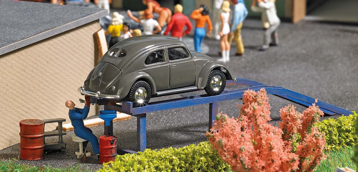 Action Set für die realistische Belebung Ihrer Modellwelt. Werkstattrampe für Ölwechsel und weitere Wartungsarbeiten. Mit VW-Käfer, Ölauffangwanne, Ölfässern und Mechaniker.