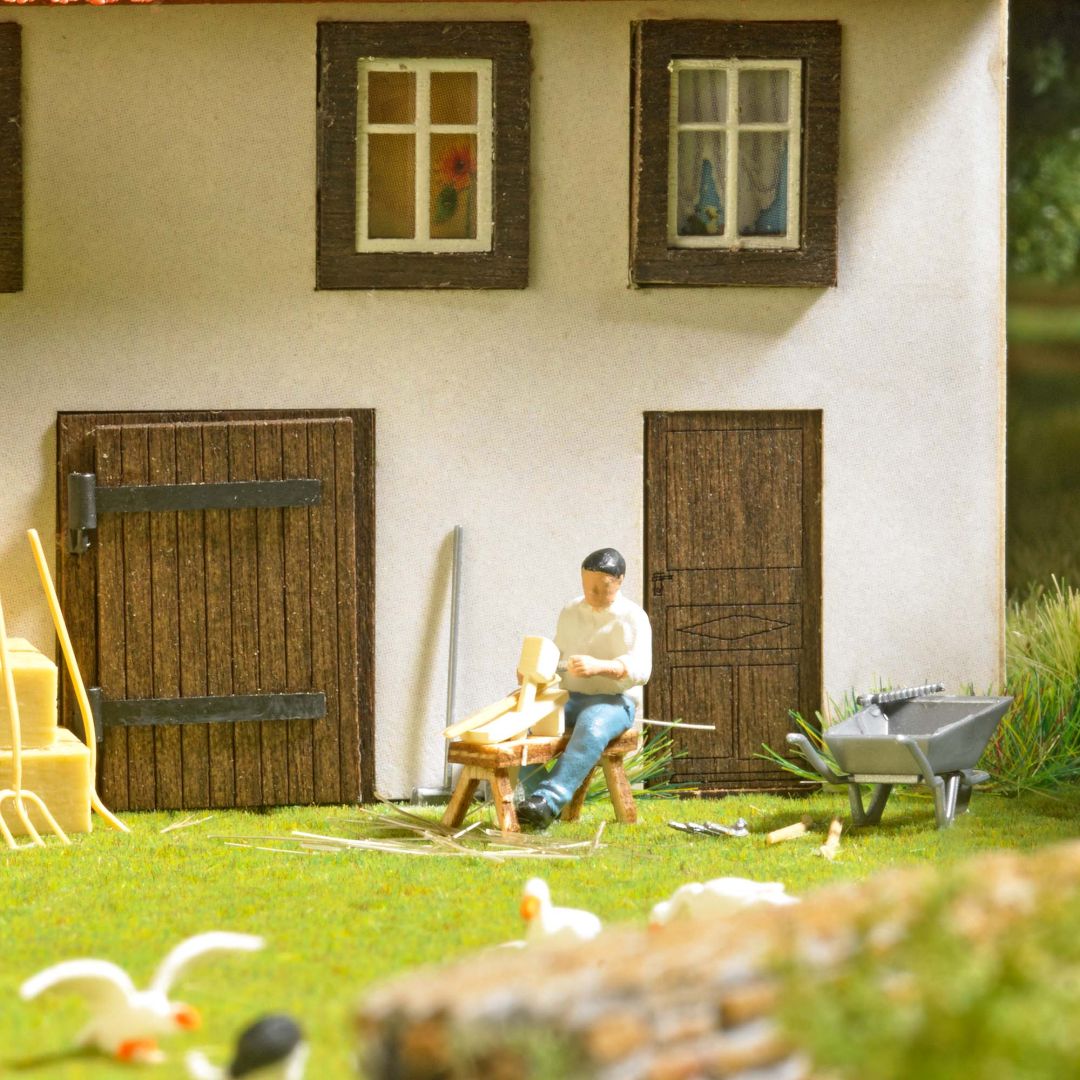 Der Holzschnitzer hat sein Werkstück auf der Schnitzbank fixiert. Jetzt geht´s an die Feinarbeit, und dabei fallen natürlich auch Späne. Zur weiteren Ausschmückung sind Holzstäbe, Heuballen, Schubkarren und Werkzeug im Set enthalten.