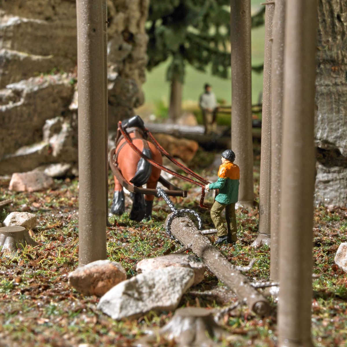 Für die realistische Belebung Ihrer Modellwelt. Mit thematischem Zubehör und mindestens einer Figur (bemaltes Fertigmodell) in passender Position. Beim Schauholzrücken wird gezeigt, wie man früher geschlagene Bäume aus dem Wald transportierte. Heute wird wieder verstärkt auf den Einsatz von Pferden gesetzt, um den Waldboden zu schonen. Set enthält Pferdewirt mit Kaltblüter inklusive Rückeausrüstung und Baumstamm sowie lose Wurzeln, Äste und Baumstämme. Perfekt für die Epochen 5 und 6 geeignet.