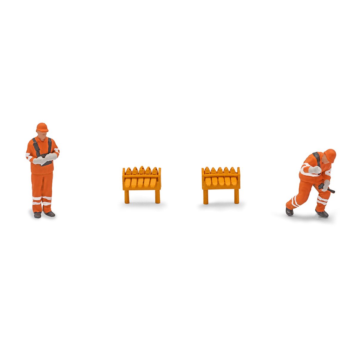 Rangierer mit Fernsteuerung und Wagenmeister bei der Wagenkontrolle in Arbeitskleidung der Epoche 5-6. Action Set inklusive 2 Hemmschuhständer für die weitere Ausgestaltung.