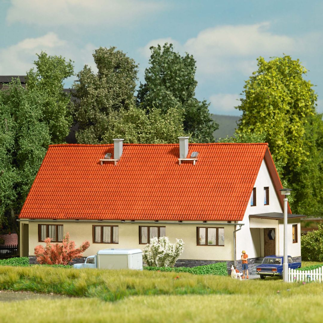 Der Bausatz stellt das weit verbreitete, standardisierte Einfamilienhaus EW 65 als Doppelhaus dar. Einst im VEB Kombinat Bau Meiningen projektiert, sind heute noch viele Gebäude im Original erhalten. Im Modell sind die typischen Details perfekt nachgestellt: Verputzte Fassade im DDR-typischen Farbton. Türen, Fenster und Fensterrahmen aus echtem Holz. Treppenaufgang mit vorbildgerechter Überdachung. Dach mit Kaminen, Dachausstiegen und Laufrosten für den Kaminkehrer sowie filigrane Regenrinnen und Fallrohre aus Kunststoff. Beleuchtbar mit Busch LEDs 5998. Größe TT: 166 x 80 mm, 71 mm.