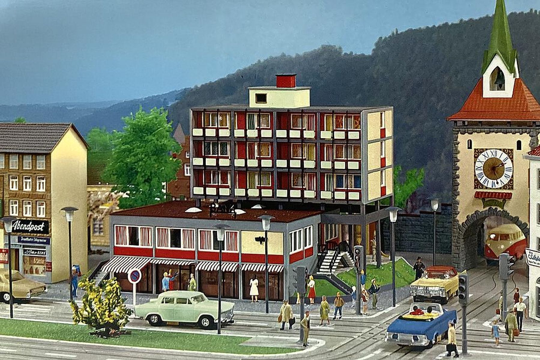 Modellbau-Nostalgie pur! Der mehrstöckige Modellbau präsentiert sich in einem schlichten, modernen Stil. Im Erdgeschoss befindet sich eine Bankfiliale mit grauer Fassade, darüber liegen, etwas versetzt angeordnet, Wohnetagen in Weiß und Rot. Farbige Vorhänge in den Fenstern setzen dezente Akzente und lockern das Gesamtbild auf. Als besonderes Extra liegt dem Bausatz der Nachdruck des FALLER Magazins Nr. 52 bei. Ein echtes Highlight für Sammler und Liebhaber klassischer FALLER-Modelle!