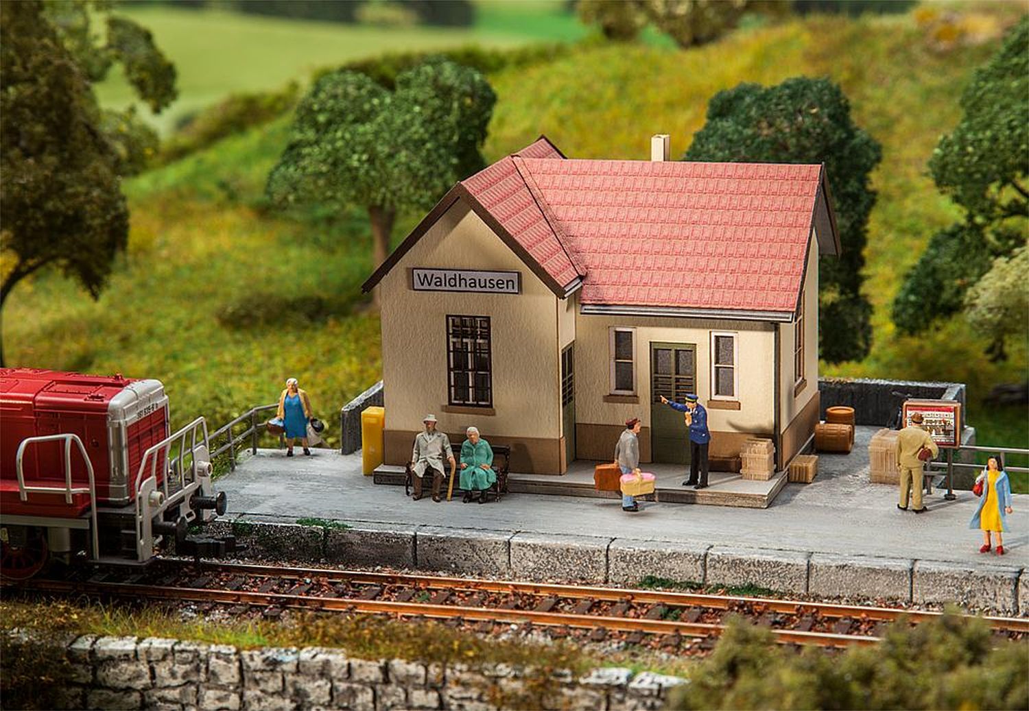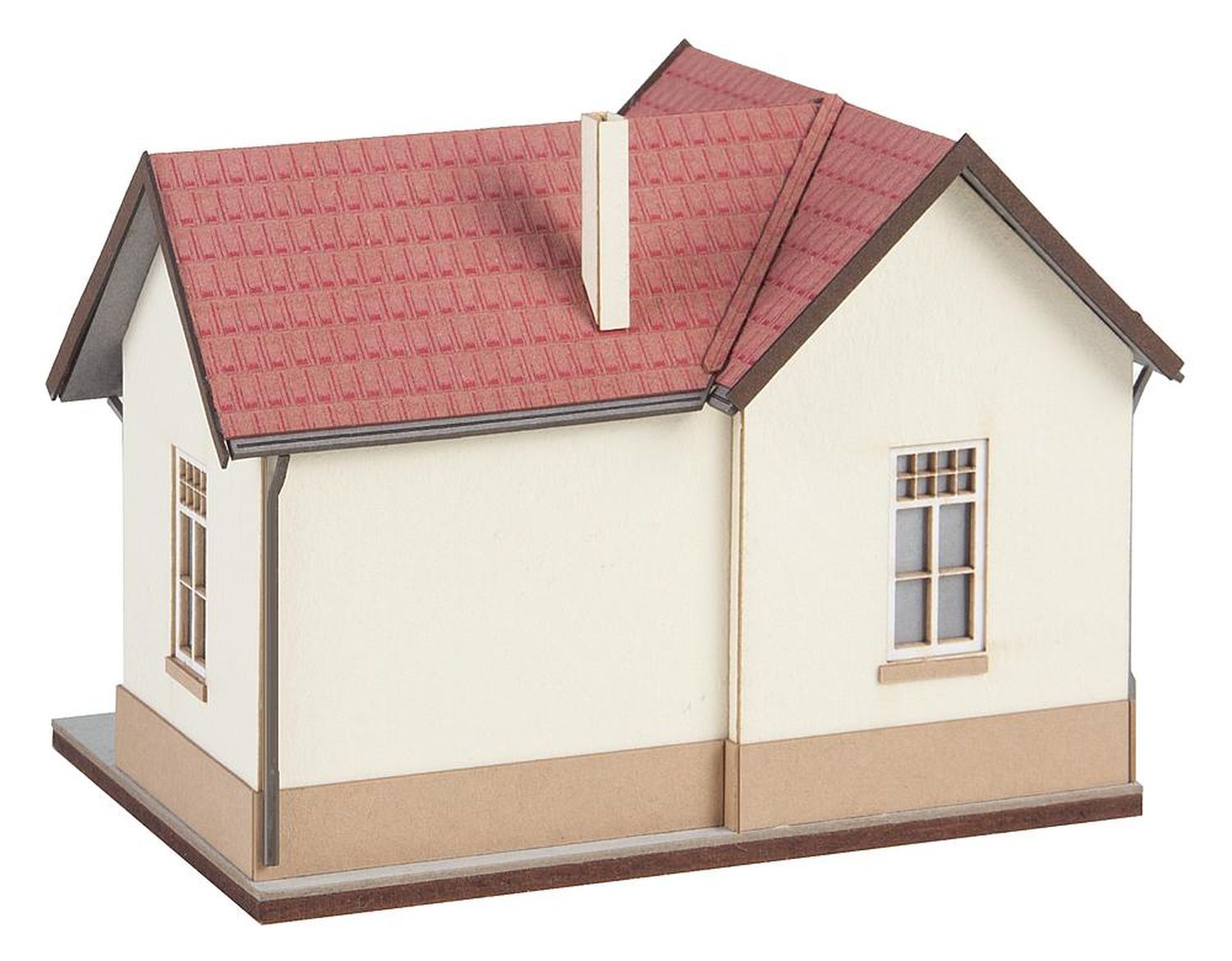 Vielseitig einsetzbar. Lasercut-Modell des ländlichen Haltepunkts »Waldhausen« an der von den Ulmer Eisenbahnfreunden betriebenen Lokalbahnstrecke Amstetten-Gerstetten mit umlaufendem Sockel, heller Putzfassade und einem über Eck verlaufenden Satteldach.