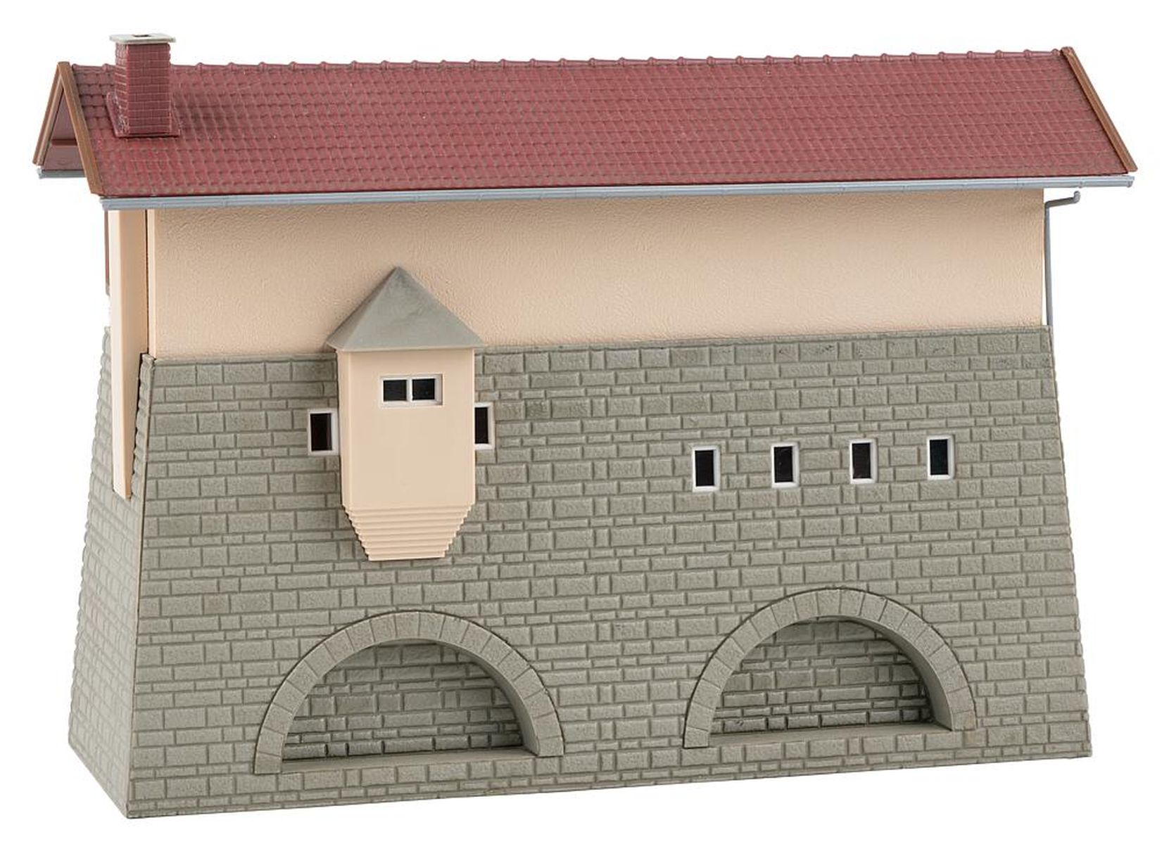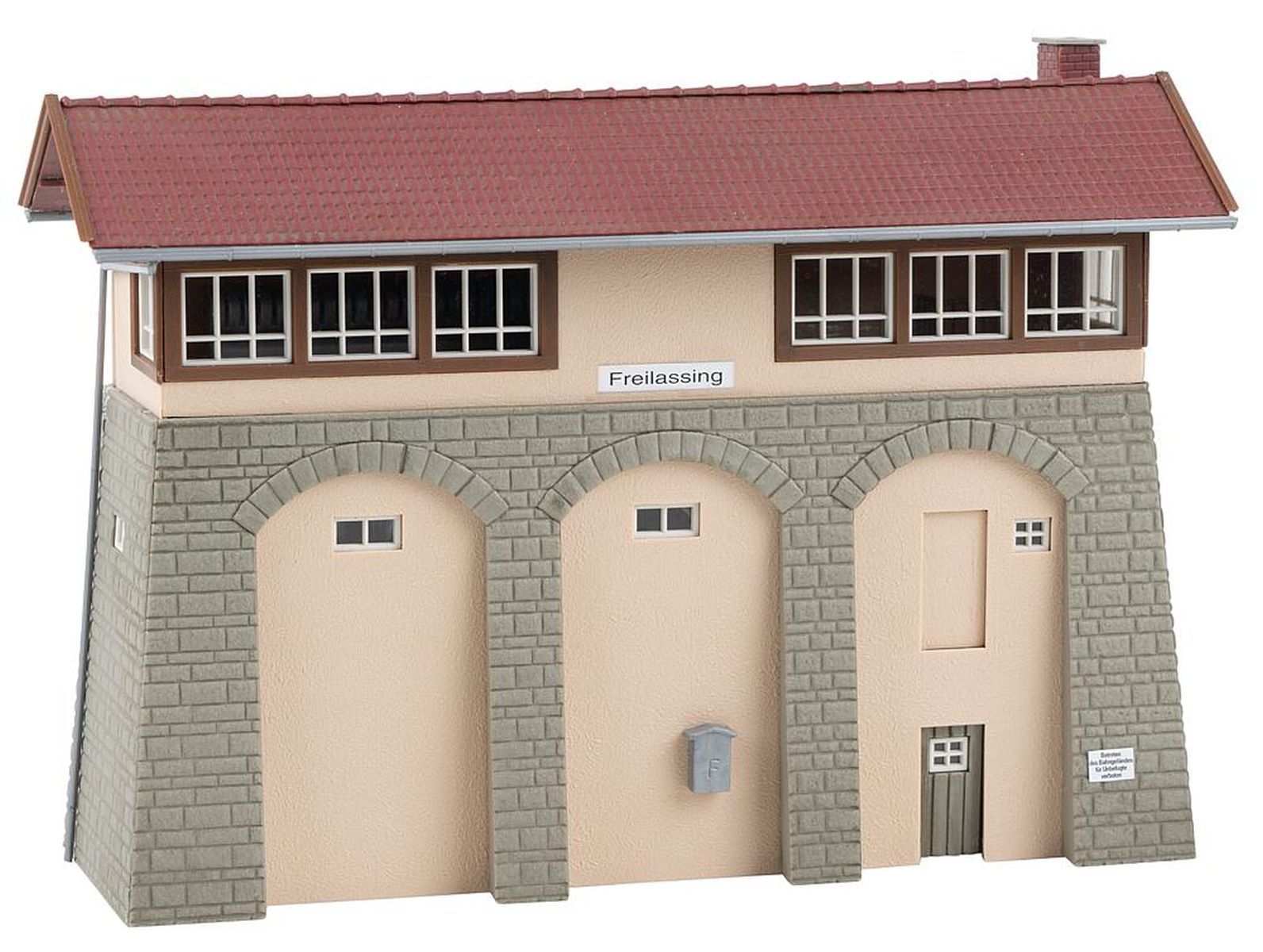 Stellwerk mit gemauerten Rundbögen und einem Satteldach nach dem Vorbild des ehemaligen Stw 1, Freilassing.