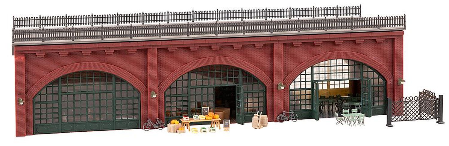 Nach dem Vorbild der Berliner und Wiener Stadtbahnbögen aus dem 19. Jahrhundert. Zweigleisiges Hochbahntrassen-Segment mit rötlicher Sichtziegel-Fassade und drei großflächig verglasten Arkaden, die Gewerbetreibenden als Nutzfläche dienen. Umfangreiches Zubehör für die Ausstattung eines Obst- und Gemüsehandels, eines Cafés und eines Antiquitätenhandels in den Gewölben liegen bei. Trassierung für alle Gleissysteme geeignet.