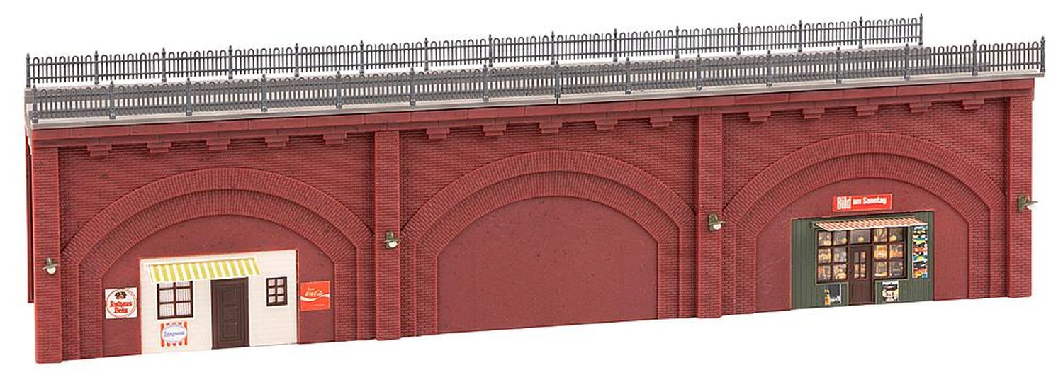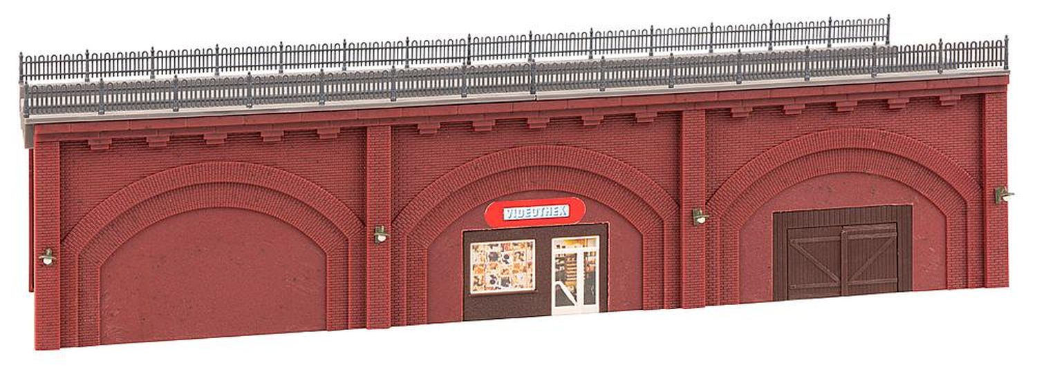 Nach dem Vorbild der Berliner und Wiener Stadtbahnbögen aus dem 19. Jahrhundert. Zweigleisiges Hochbahntrassen-Segment mit rötlicher Sichtziegel-Fassade und drei Viaduktbögen, die Gewerbetreibenden zum Teil als Nutzfläche dienen. Für alle Gleissysteme geeignet.