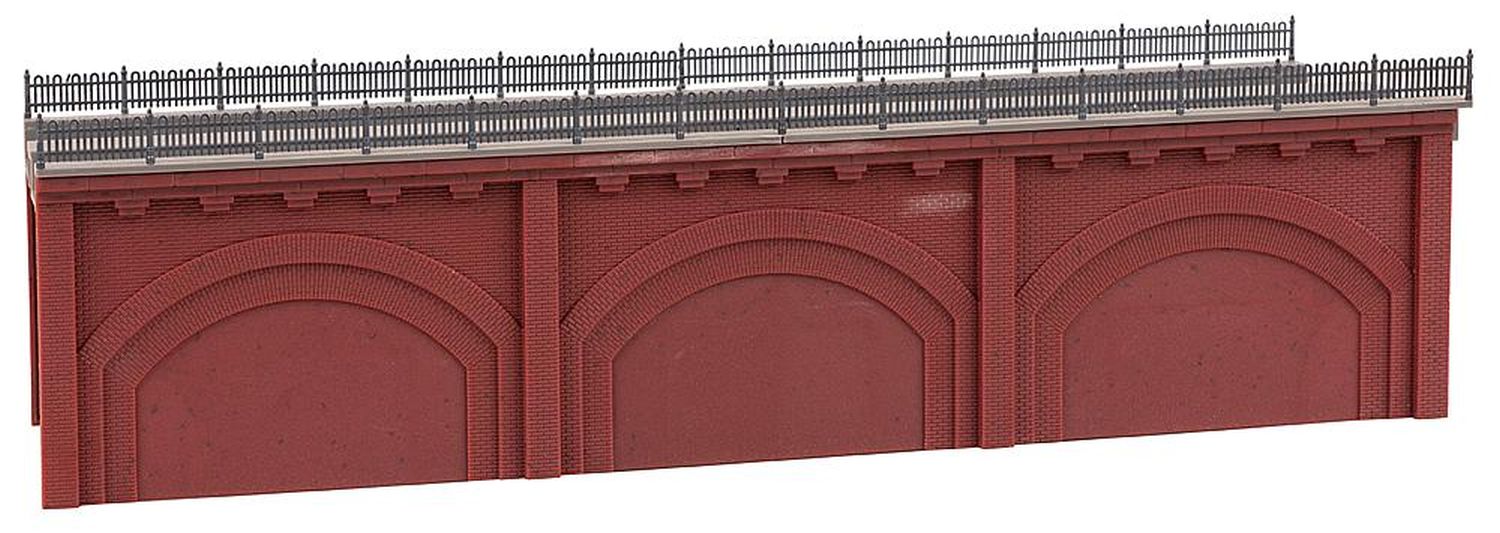 Nach dem Vorbild der Berliner und Wiener Stadtbahnbögen aus dem 19. Jahrhundert. Zweigleisiges Hochbahntrassen-Segment mit rötlicher Sichtziegel-Fassade und drei zugemauerten Viaduktbögen. Für alle Gleissysteme geeignet.