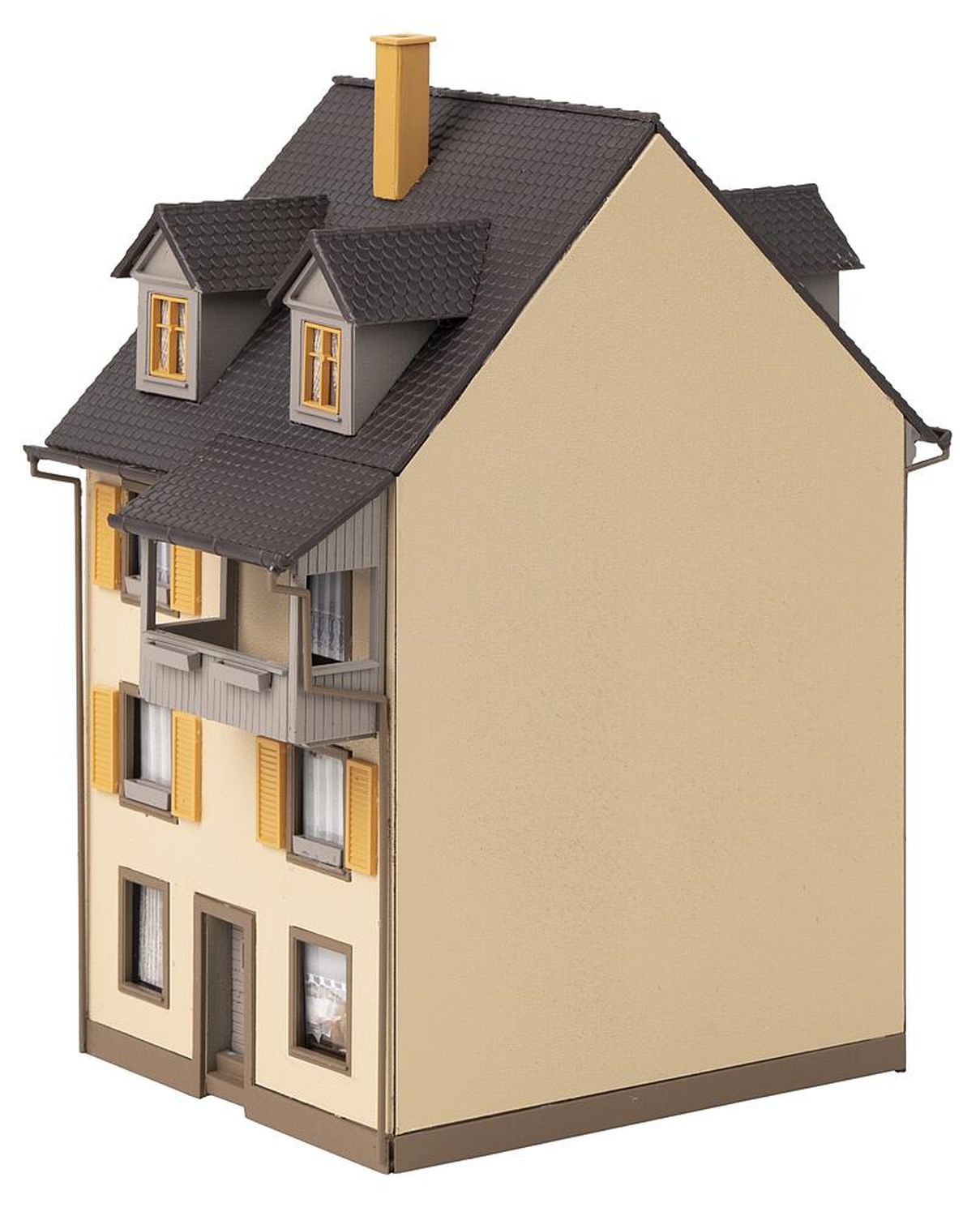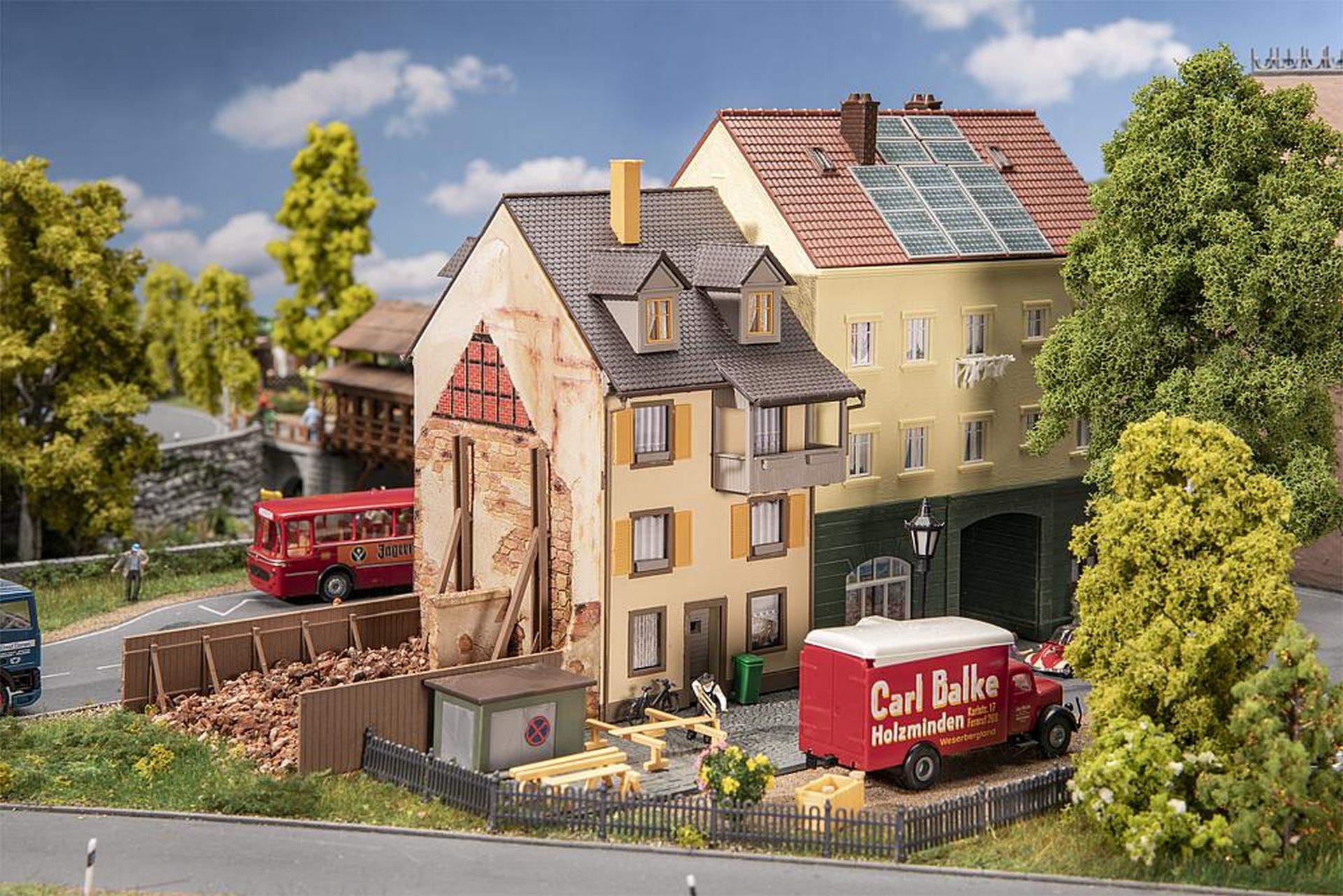 Dreistöckiges Wohnhaus mit einem Satteldach, Gauben, einem Balkon und einer Fahrschule im Erdgeschoss. Nach Abbrucharbeiten auf dem Nebengrundstück wird eine der Außenwände mit Stützen gesichert. Für die Sicherung der Baustelle liegt ein Bretterzaun bei.