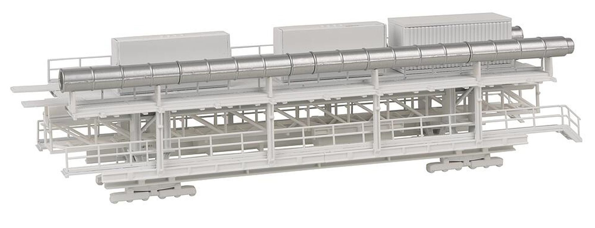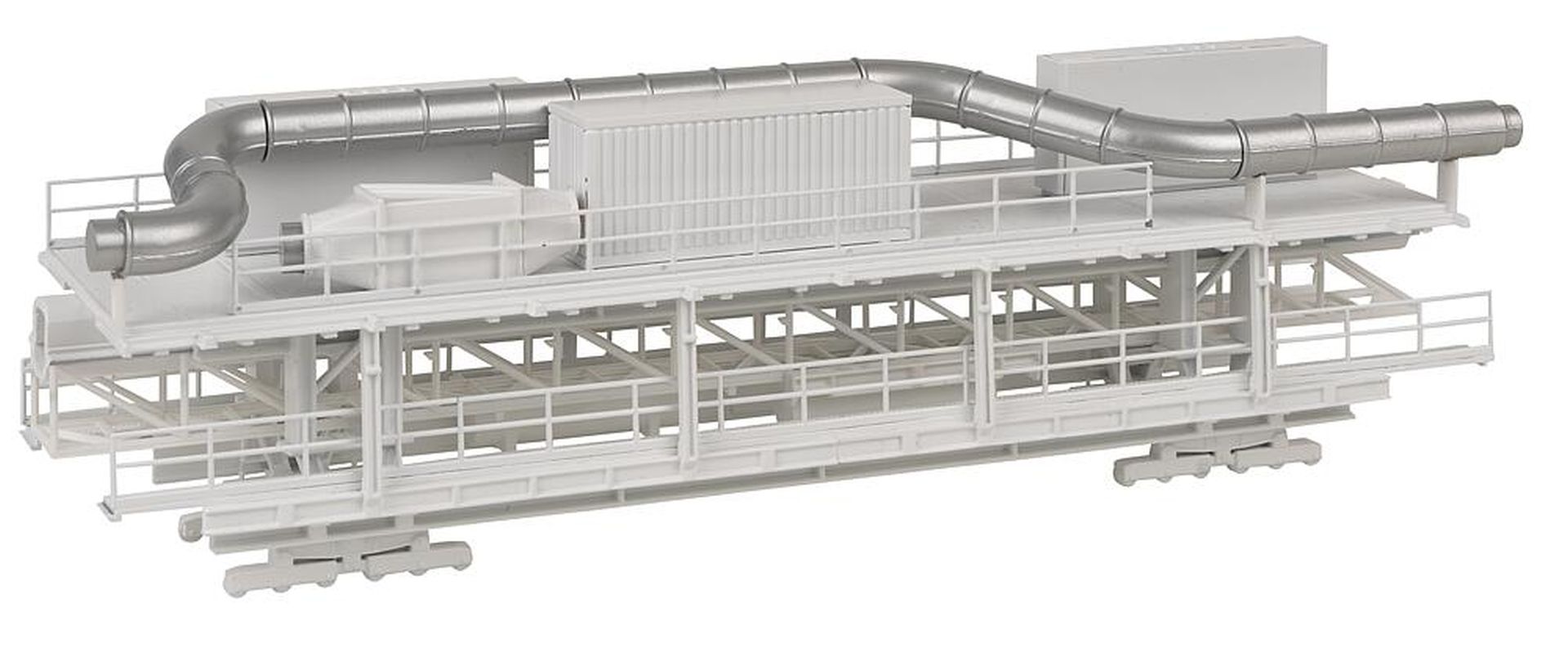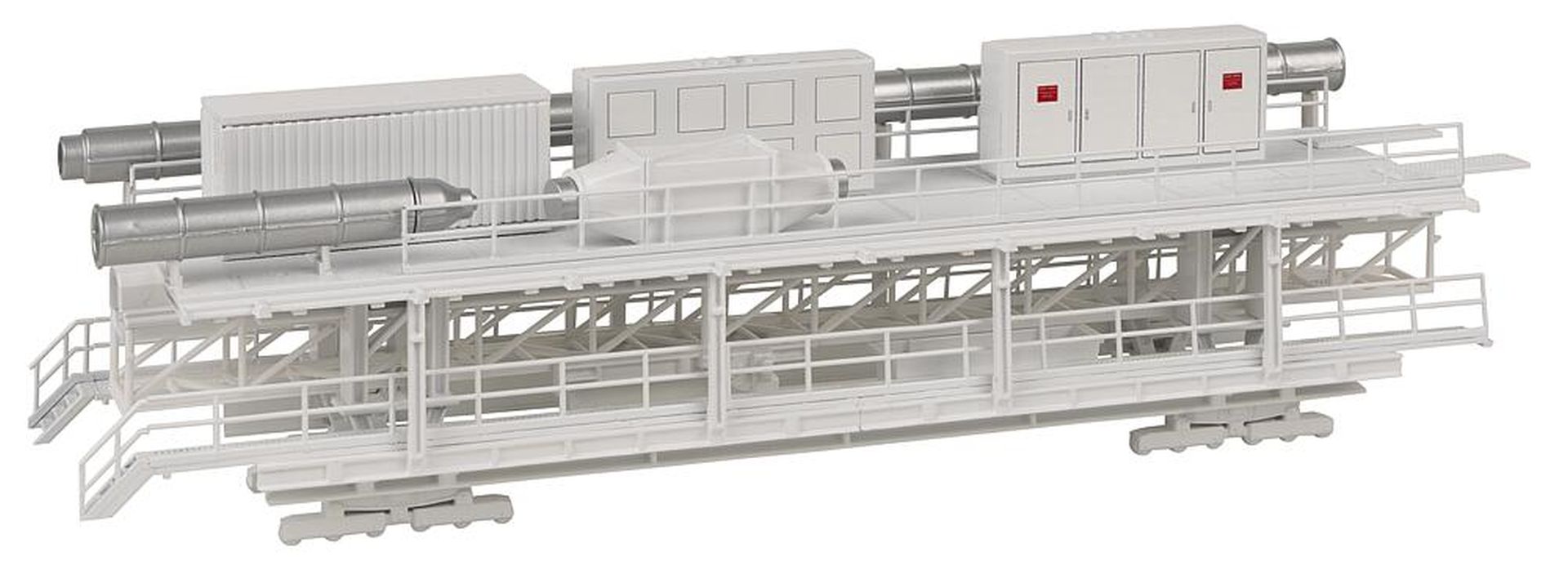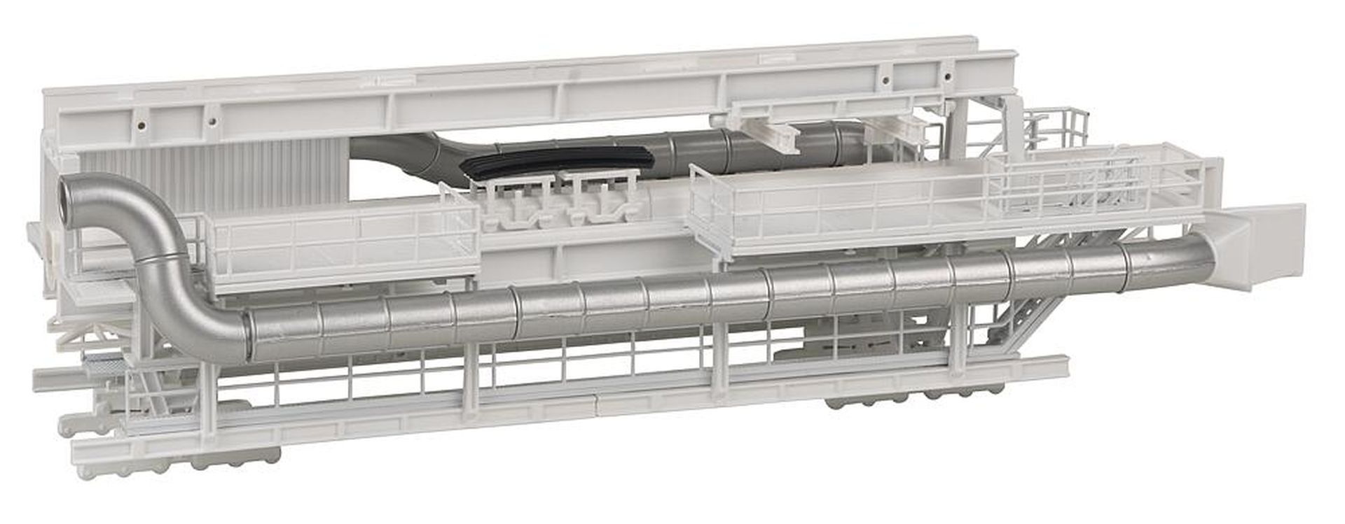 Varianten-Kit! Standmodell eines von einer »Gripper-TBM« Tunnelvortriebsmaschine gezogenen Nachläufers mit diversen Förderanlagen, Vorrichtungen und Maschinen für den Tunnelbau, Trafos, Pumpen, Equipment-Containern und Steuereinheiten. Der Bausatz kann in verschiedenen Varianten aufgebaut werden.