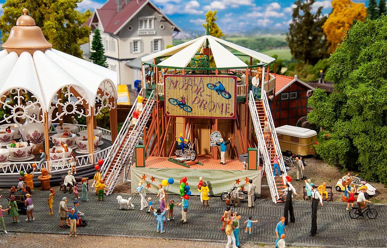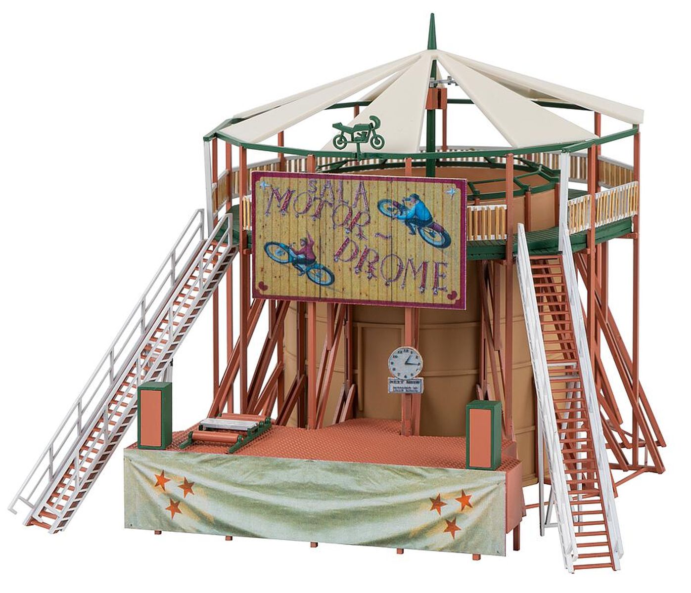 Kirmes-Nostalgie! Funktionsmodell einer Motorrad-Steilwandshow mit zwei fahrenden Motorrädern nach dem Vorbild des 1937 in Sala, Schweden gebauten »Sala Motor-Drome«, eine der ältesten fahrenden Steilwand-Attraktionen. Die vorgelagerte Bühne, ein Motor und eine Steuerungsplatine sind im Bausatzumfang enthalten.