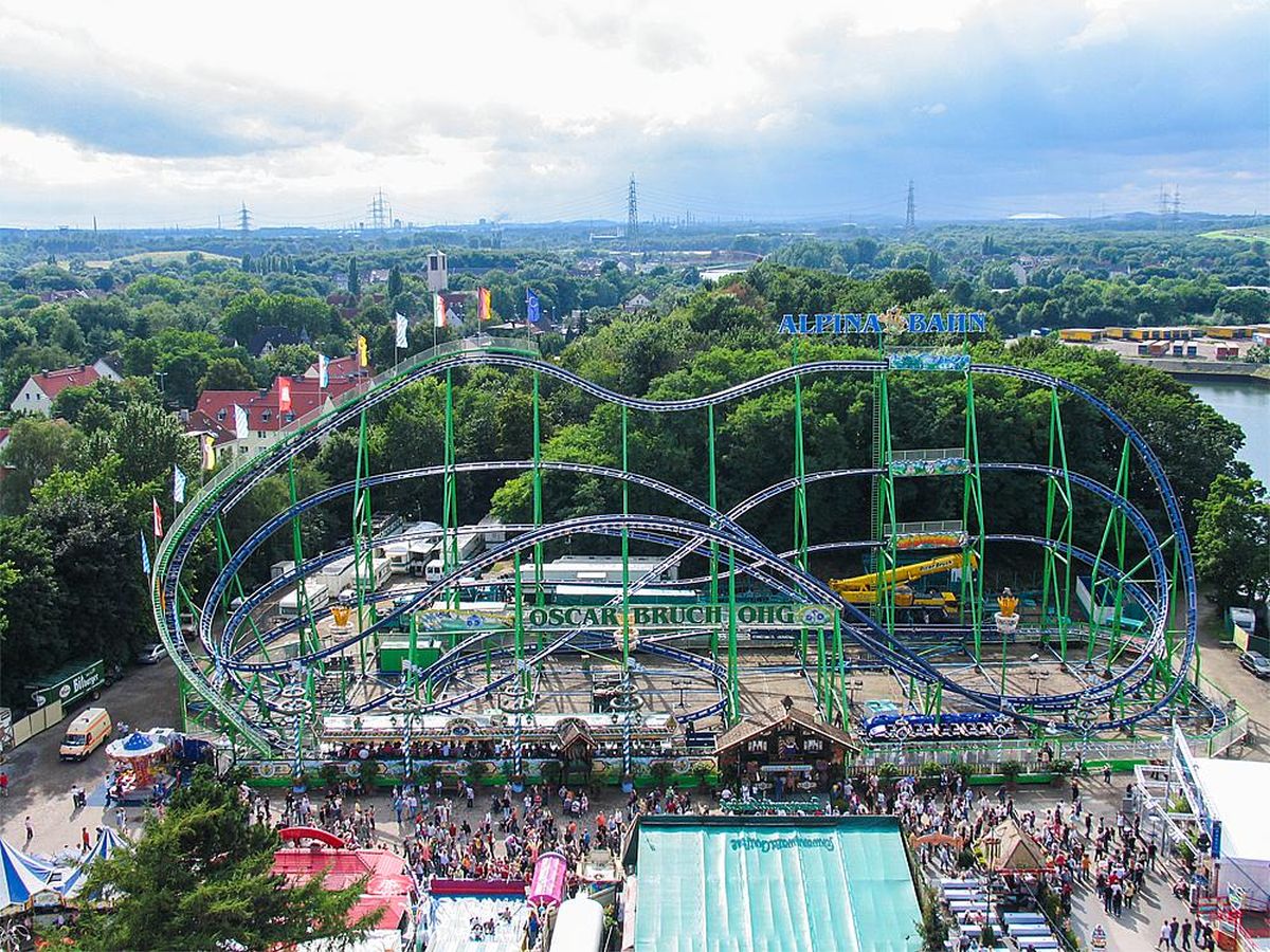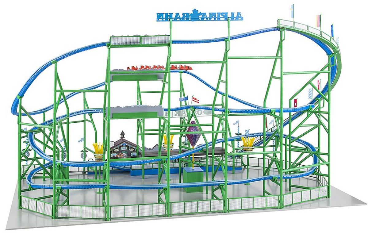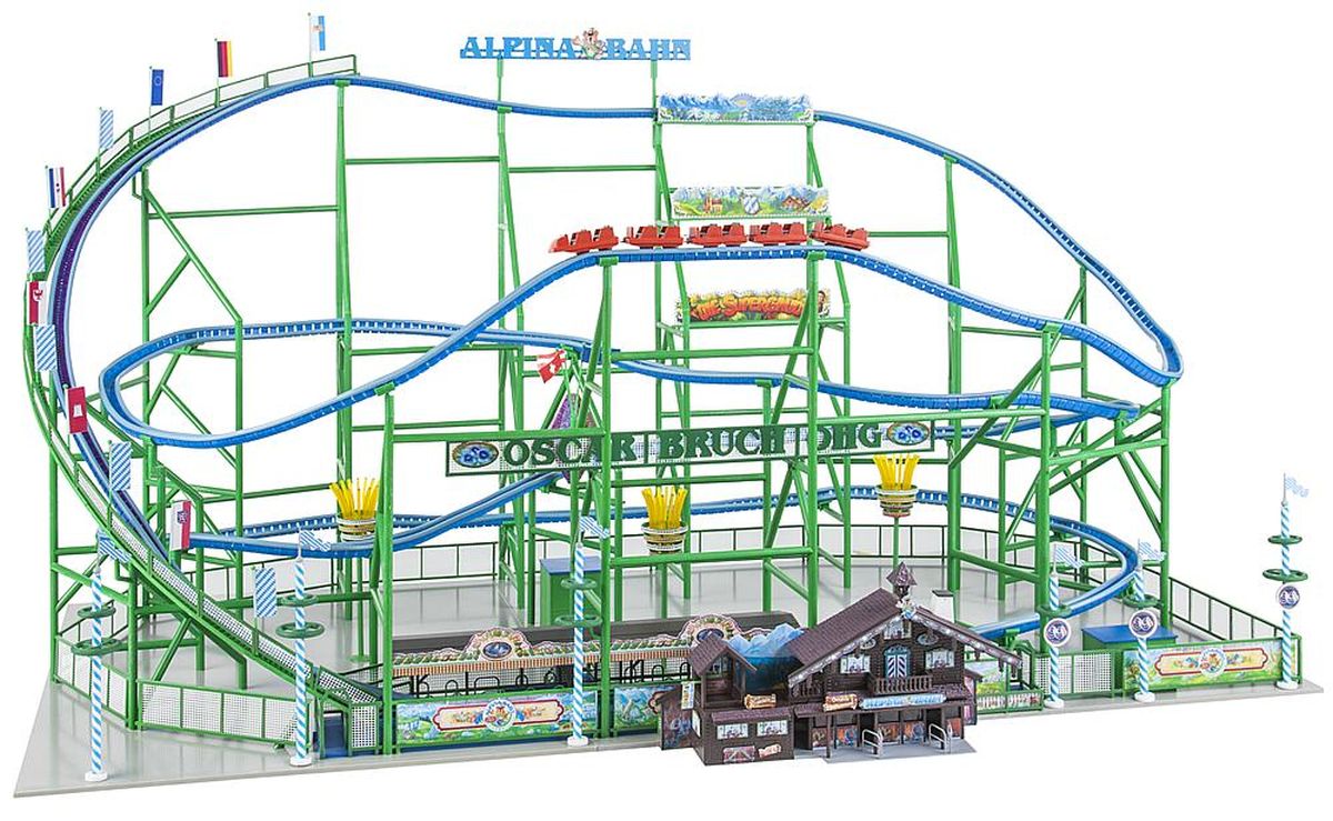 All Hail the Coaster Queen. Funktionsmodell der transportablen Stahlachterbahn »Alpina-Bahn« der Schaustellerfamilie Oscar Bruch. Fronten und Dekoteile, das Holz-Kassenhaus und Figuren in bayerischer Tracht thematisieren zünftige Alpenhütten-Stimmung, erdacht und gestaltet von den Kreativen des Stuhrer Ateliers für angewandte Werbung (»afaw«). Ein Antriebsmotor für die Auffahrt zum Lifthill und Steuerungselektronik für den Aufenthalt im Bahnhof sind im Bausatzumfang enthalten. Die Fahrstreckenlänge ist im Vergleich zum Originalvorbild verkürzt: ca. 5500 mm.