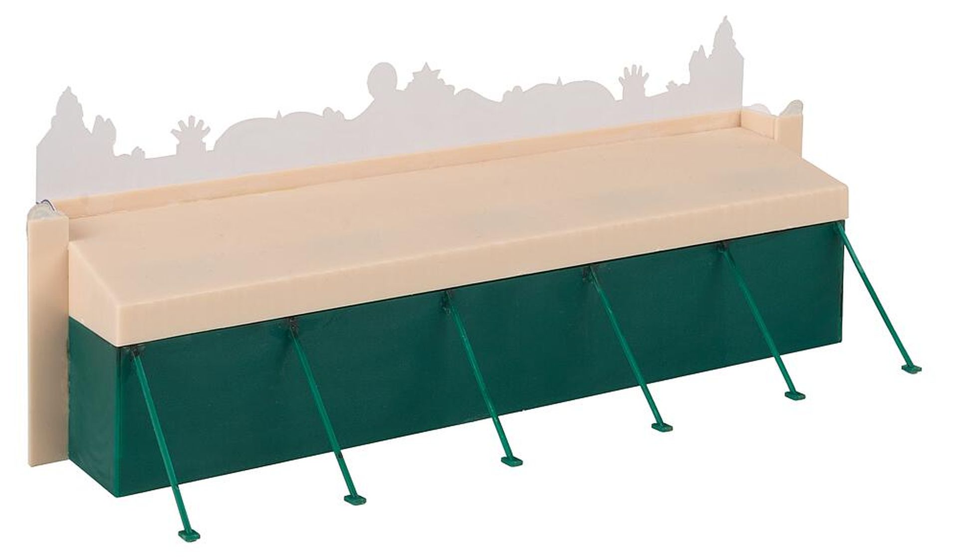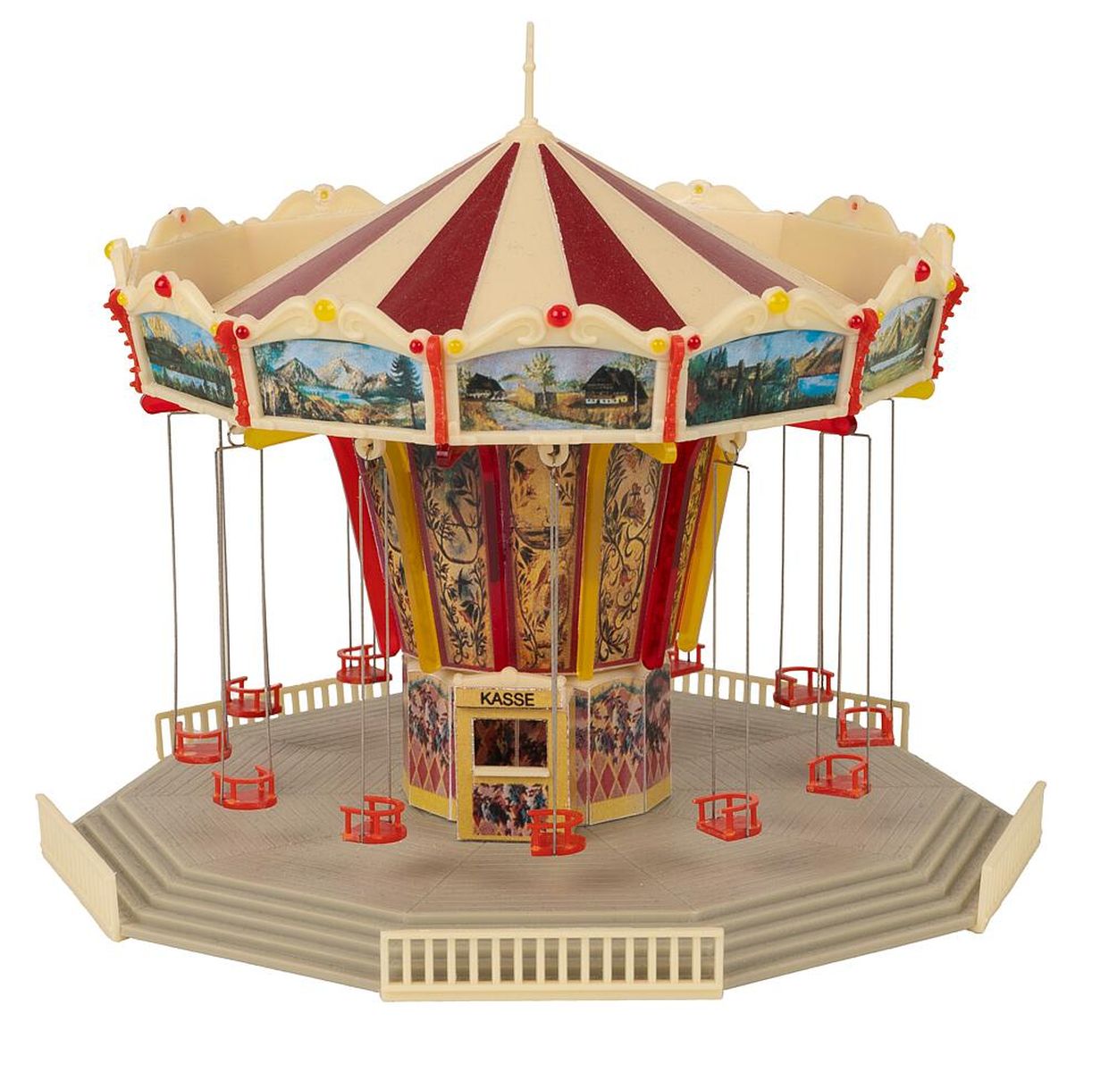 Kettenkarussell: Ausgestattet mit 12 Sitzplätzen, farbig gestalteten Dachsegmenten und indirekt bunt beleuchteten Dachträgerstreben der Mittelsäule. Dem Modell liegt eine Micro-Kabelbirne und ein Antriebsmotor (12-16 V, Wechselspannung) bei. Schiffsschaukel mit Antrieb: Ein Modell mit 5 Schiffschaukelplätzen und bunten Dekorbildern. Voll funktionsfähig mit Antriebselement, das das Schwingen jeder einzelnen Gondel in unterschiedlichem Rhythmus ermöglicht. Ausgerüstet mit Blinkmechanik. Zum Betreiben der Blinkereinheit liegt eine Micro-Kabelbirne (Art. 180671) bei. Der Bausatz enthält einen Motor (12-16 V, Wechselspannung).