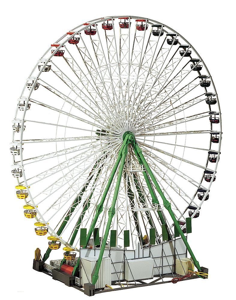 36 farbige, beleuchtbare Gondeln, Gesamthöhe von 520 mm, Jupiter-Schriftzug, Kassenhaus und vordere Stützstreben lassen sich effektvoll beleuchten. Mit Antriebsmotor (16 V, Wechselspannung). Für die Beleuchtung aller Gondeln des Jupiter-Schriftzuges und der vorderen Stützstreben wird das Riesenrad-Lichtset (Art. 140471) benötigt, das nachträglich montierbar ist.