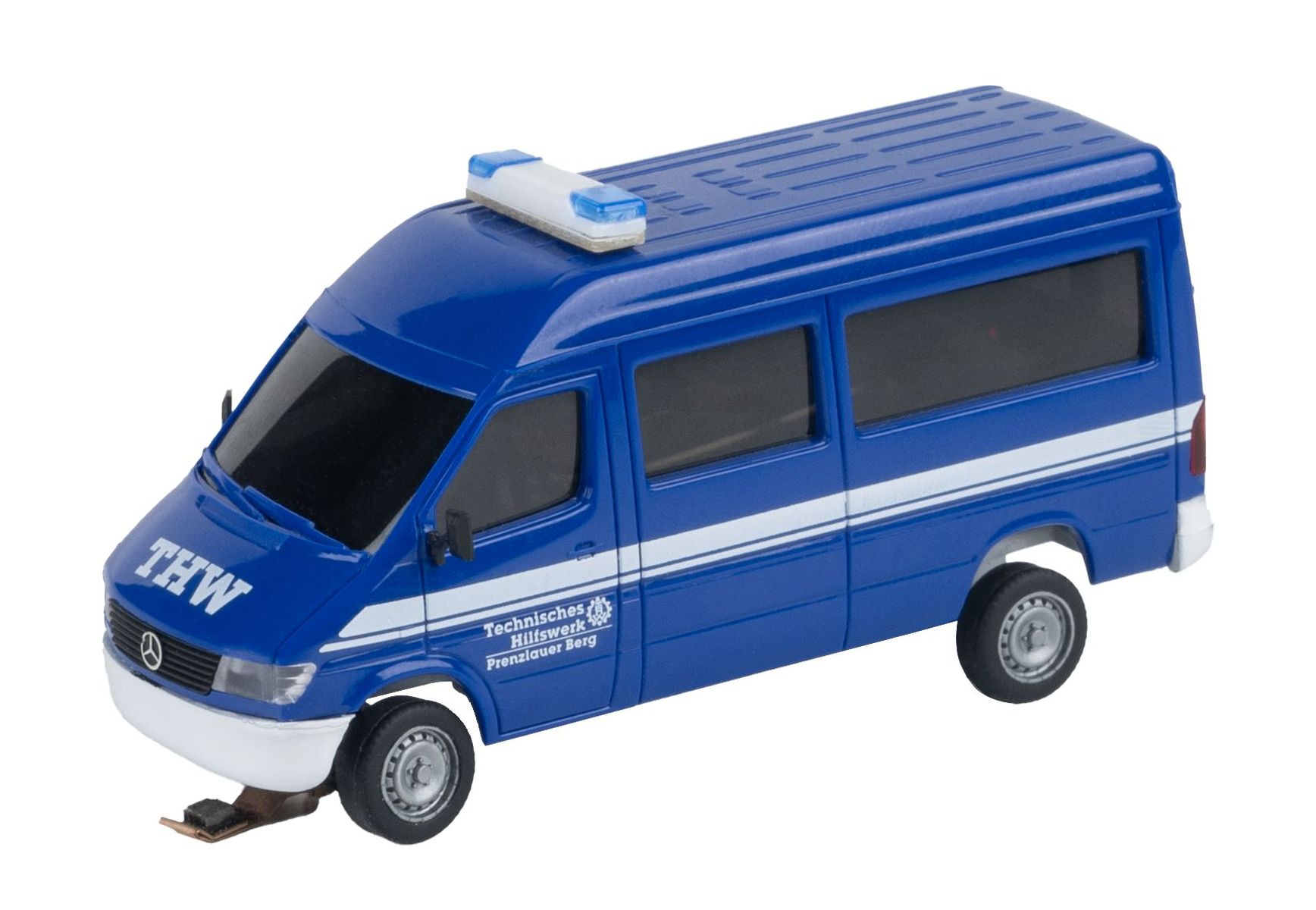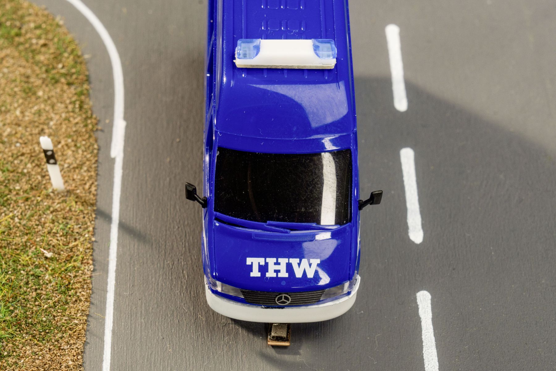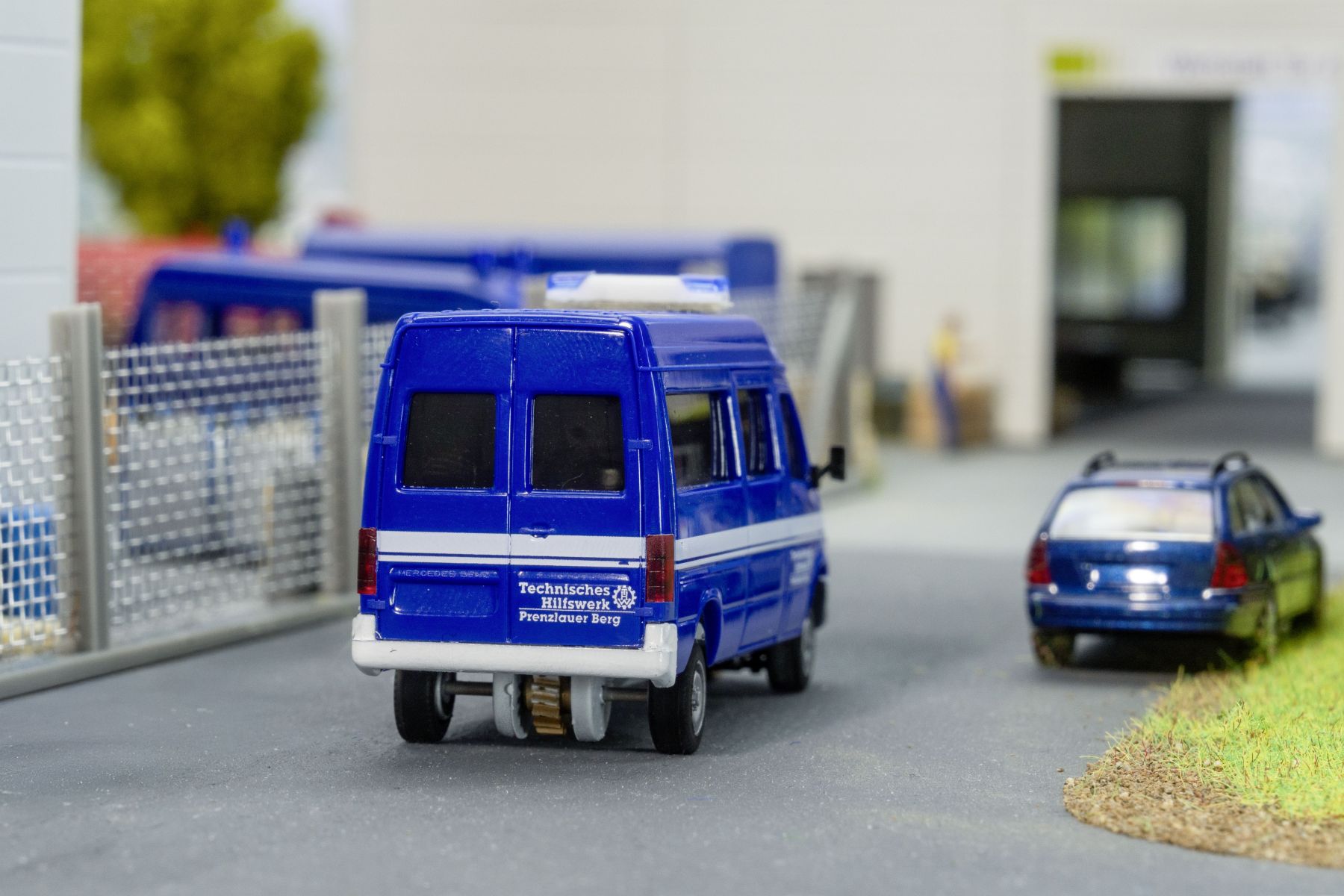 Ein tiefblauer THW-Sprinter fährt über die Miniaturstraße, bereit für seinen nächsten Einsatz. Dieses Modell bringt Schwung und Dynamik auf die Anlage und ergänzt diese perfekt!