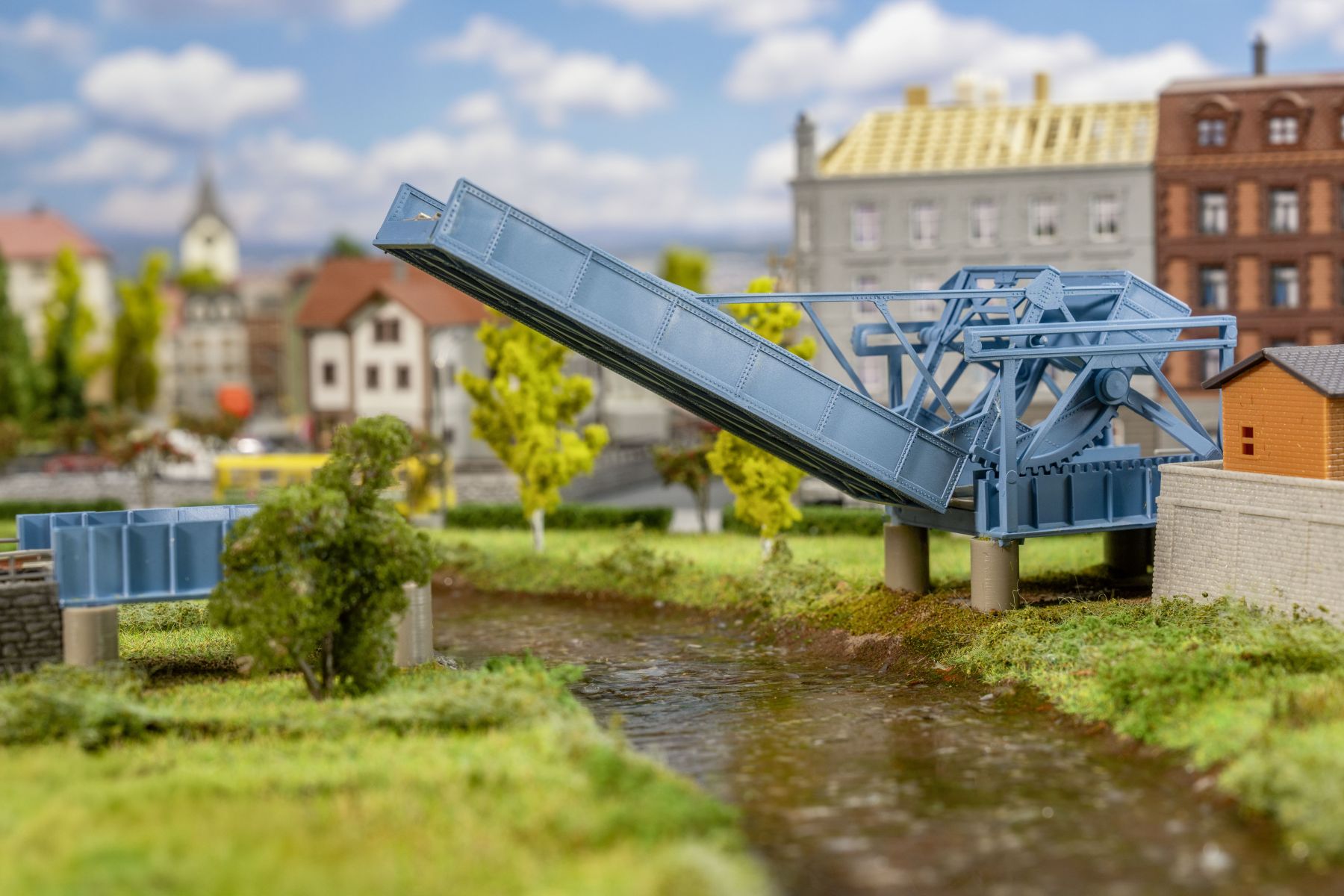 Dieses bewegliche Modell einer Eisenbahnklappbrücke mit passendem Betriebsgebäude verleiht jeder Modellbahnanlage zusätzliche Dynamik. So lässt sich der Verkehr von Schiffen und Zügen noch realistischer darstellen. Der Antrieb erfolgt über einen im Bausatz enthaltenen Getriebemotor. Zudem sind eine kleine Steuerung zur Geschwindigkeitsregulierung und ein Drucktaster im Set enthalten.