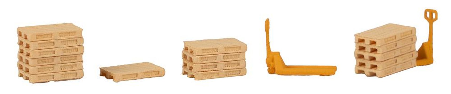 Set bestehend aus zwei Hubwagen und 16 Paletten. Unverzichtbares Zubehör im Logistikbereich.