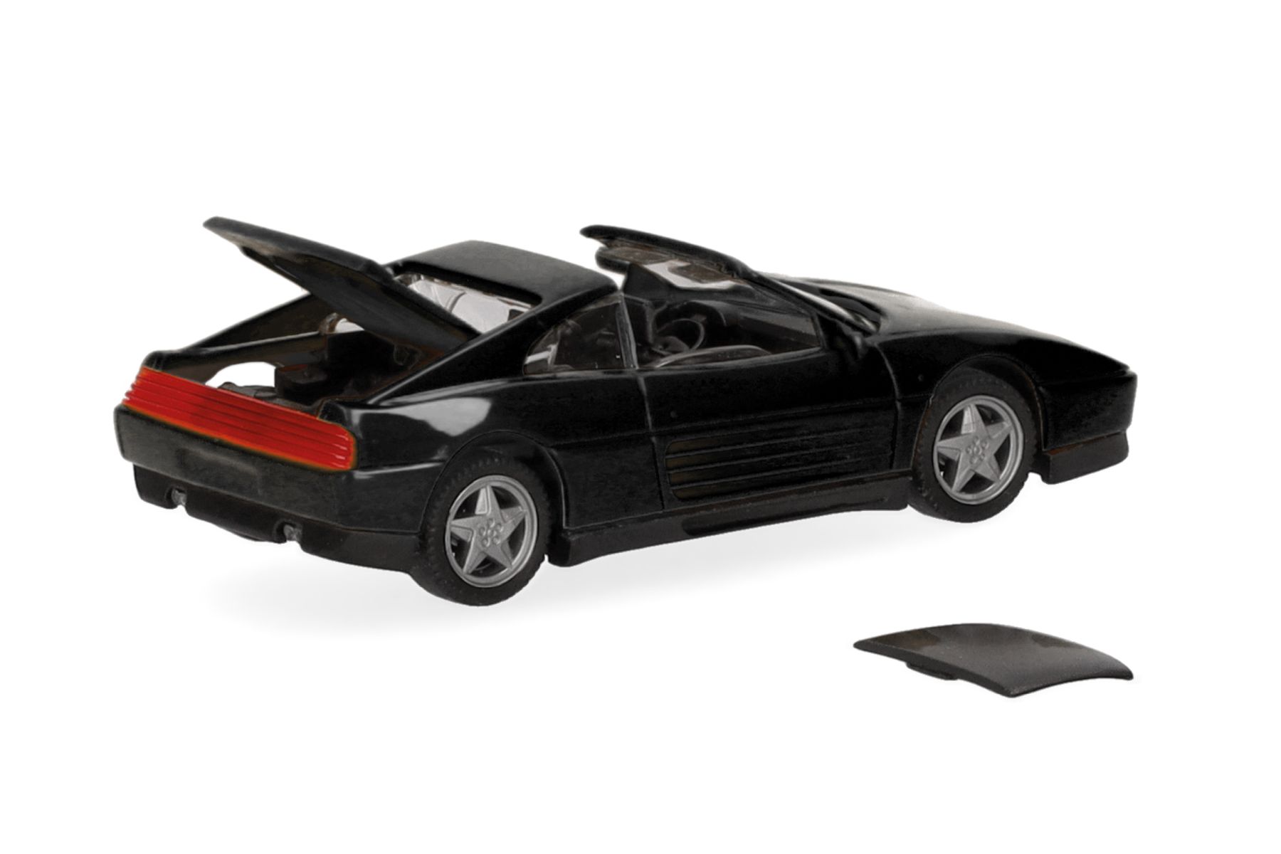Auch die Variante mit zu öffnendem Dacheinsatz, als Ferrari 348 ts benannt, hat mittlerweile den Status eines Klassikers erreicht und kommt in der Farbgebung nero bei Herpa zu neuen Ehren.