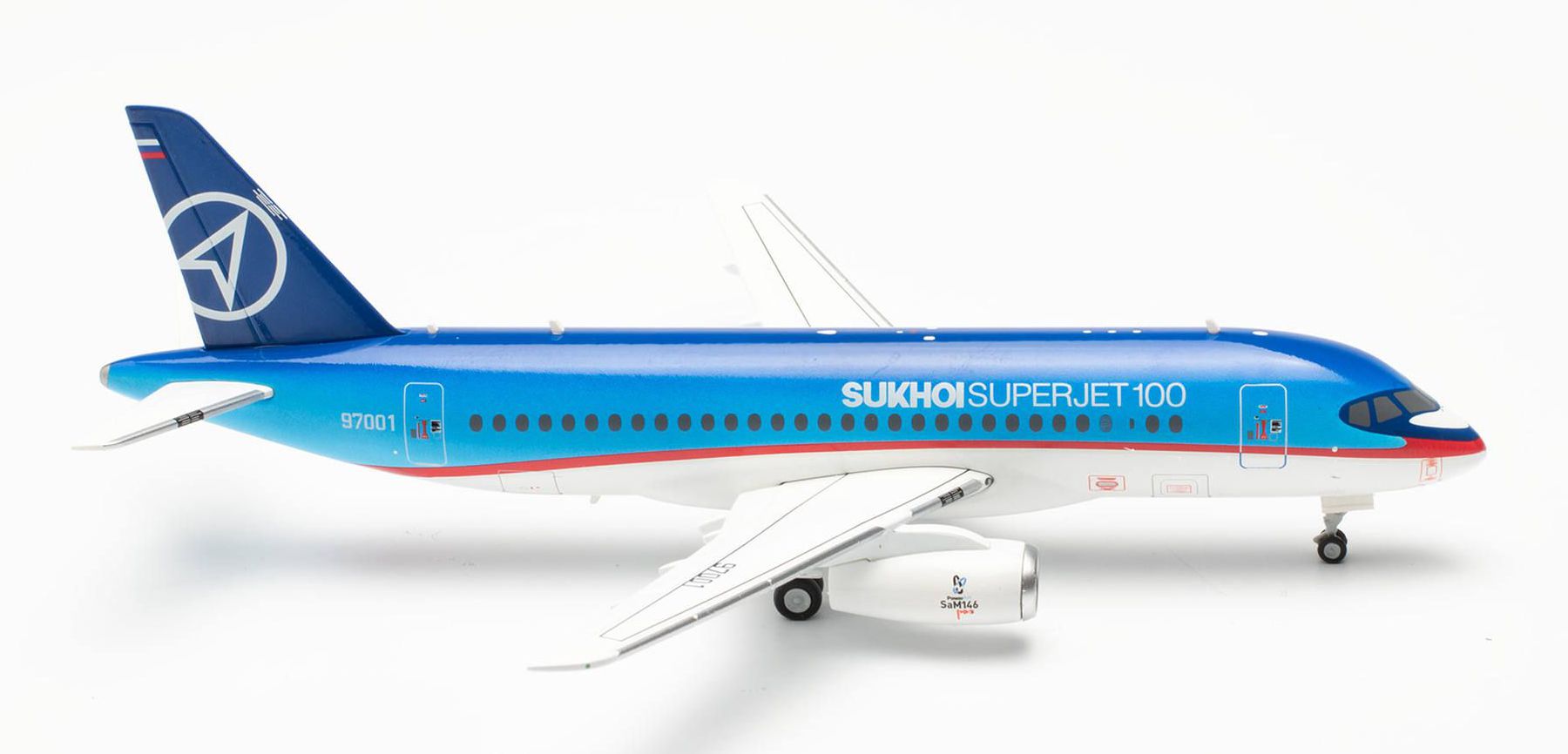 2001 startete die Zivilflugzeug-Abteilung von Sukhoi mit der Entwicklung eines neuen Regionaljets, welcher die alternden Tupolev TU-134 und Yakovlev Yak-42 aus sowjetischer Produktion ersetzen sollte. Am 19. Mai 2008 war es dann soweit: der Prototyp mit der Werkskennung 97001 hob zum Jungfernflug ab. Unser erstes Metallmodell des Superjets im Maßstab 1:200 erscheint in den Sukhoi-Werksfarben mit den auffälligen blauen Farbverläufen auf dem Rumpf. Geplagt wurde das Programm durch technische Probleme zu Beginn der Serienfertigung; die Auslieferungen an die meist russischen Airline-Kunden verzögerten sich. Die Schwierigkeiten bei den ersten Exporten nach Mexiko und Westeuropa, unter anderem auf Grund eines fehlenden Wartungsnetzes, sowie die verhängten Sanktionen als Folge des Angriffskriegs Russlands gegen die Ukraine taten das ihre, um weiteren Sand ins Getriebe zu streuen. Bislang konnten knapp über 200 Exemplare ausgeliefert werden.
