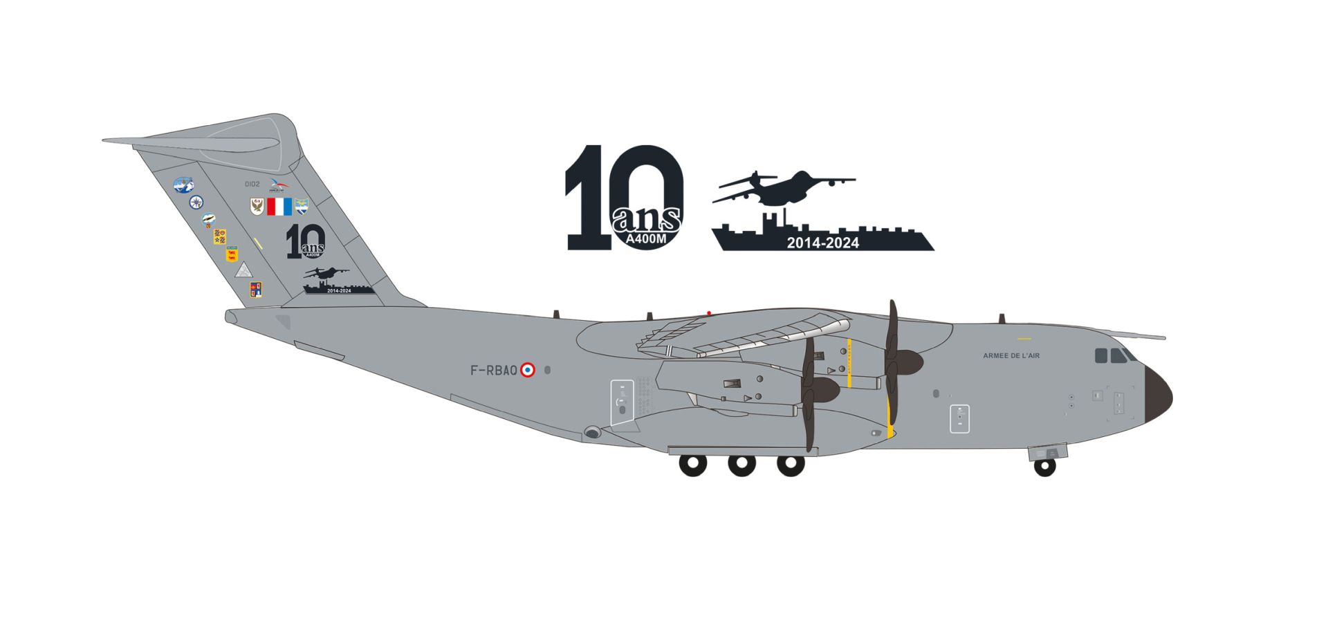 Nach einigen Rückschlägen und Programmverzögerungen, die vor allem auf den Einsatz des damals brandneuen Europrop TP400-Triebwerks, des leistungsstärksten Turboprop-Triebwerks mit einem einzigen Propeller, zurückzuführen waren, konnten die ersten A400M Atlas-Transporter ab Ende 2013 an die ersten Luftwaffen übergeben werden. Zur Feier des zehnten Jubiläums hat die 1. Staffel des 61. Geschwaders in Orleans-Bricy eine Sonderbemalung auf das massige Leitwerk eines ihrer Transporter angebracht und die Embleme der Einheiten hinzugefügt, die den A400M innerhalb der französischen Luftwaffe betreiben oder den nahtlosen Betrieb unterstützen.